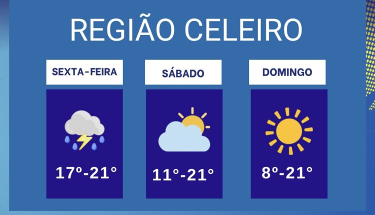 A sexta-feira (17) será marcada pela presença da chuva na região Celeiro. Conforme a previsão meteorológica, os termômetros devem registrar mínima de 17°C e máxima de 22°C, com precipitações que se estendem até a madrugada de sábado (18).