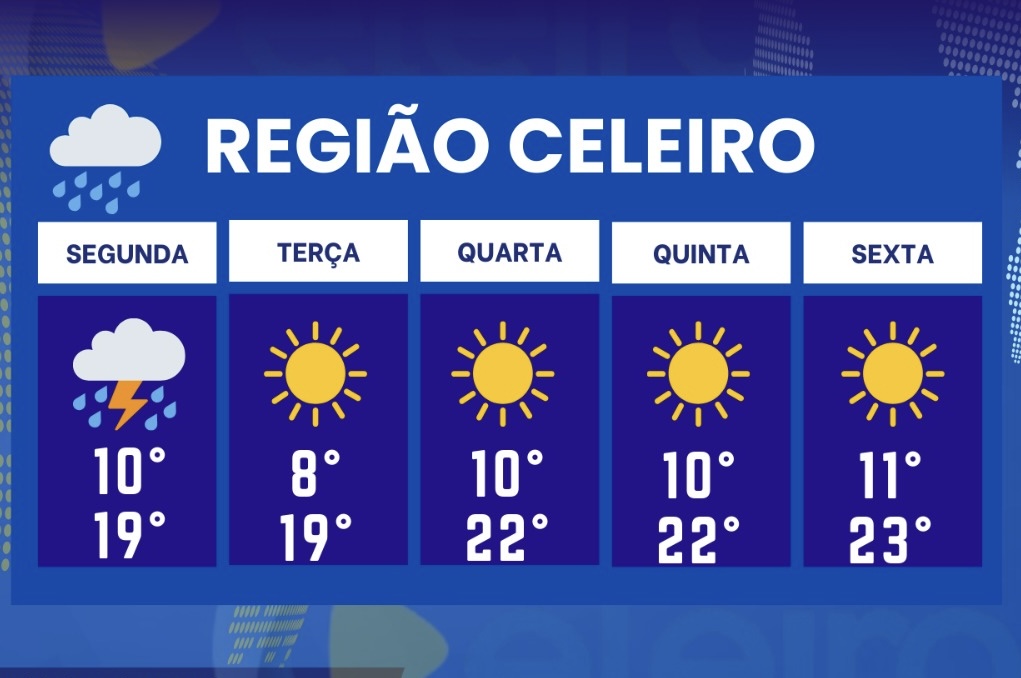 A semana começa com instabilidade na Região Celeiro, com chuva e queda nas temperaturas nesta segunda-feira, quando os termômetros variam entre mínima de 10°C e máxima de 19°C. A partir de terça-feira, o tempo volta a ficar firme e ensolarado, com mínimas entre 8°C e 10°C e máximas que sobem gradualmente, chegando a 23°C na sexta-feira.