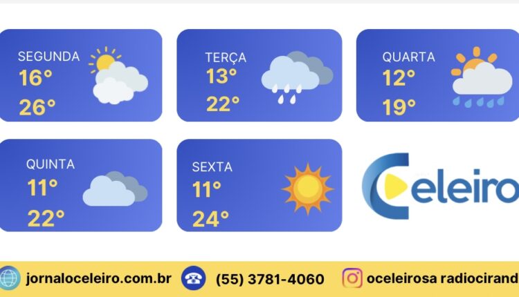 A previsão indica uma semana de variação no tempo, com momentos de chuva e períodos de sol, mas sem grandes extremos de temperatura na Região Celeiro.