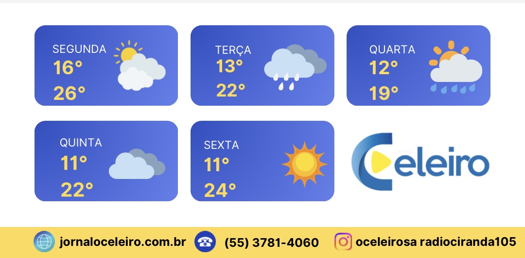A previsão indica uma semana de variação no tempo, com momentos de chuva e períodos de sol, mas sem grandes extremos de temperatura na Região Celeiro.