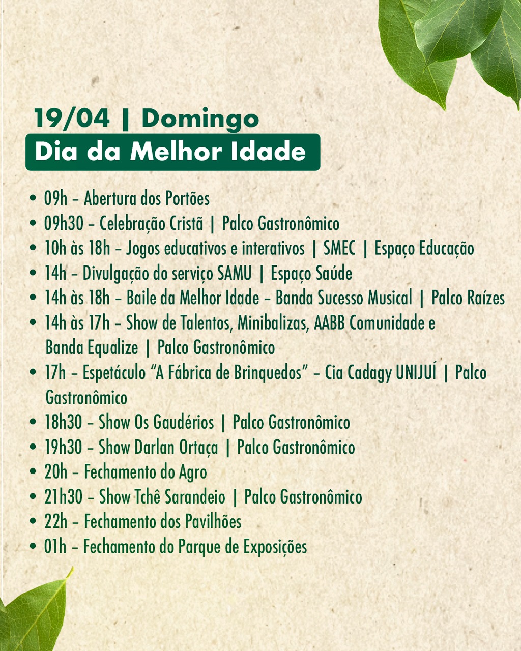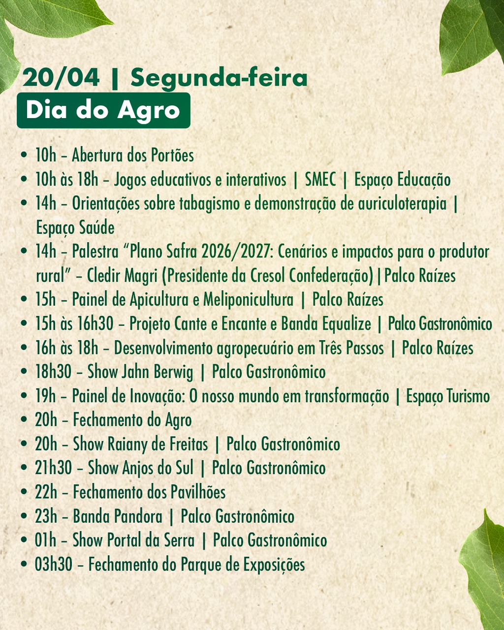 A segunda-feira (20) traz o Dia do Agro, com palestras técnicas, painéis e debates sobre o setor. Já na terça-feira (21), o encerramento será marcado pelo Dia da Mulher, com programação especial que inclui caminhada, homenagens e atividades voltadas ao público feminino.