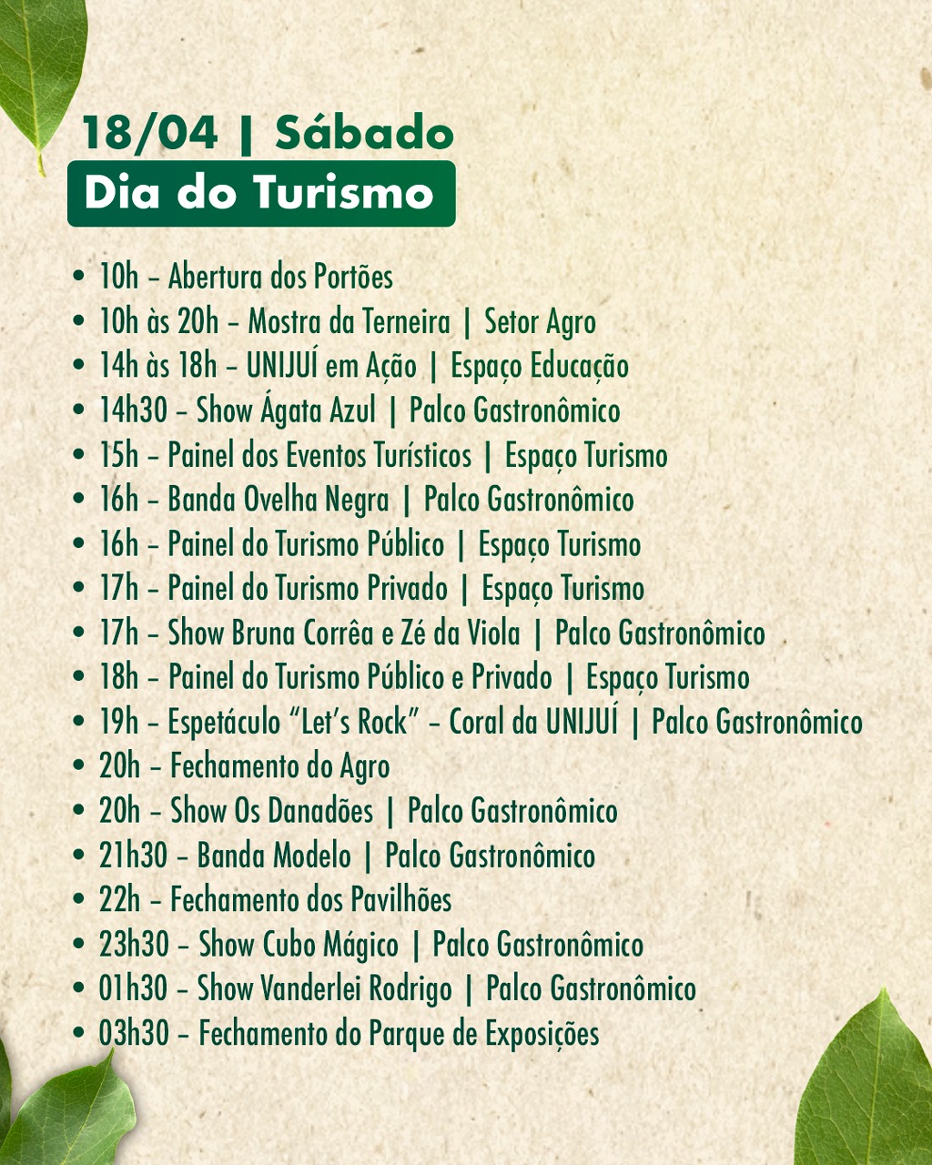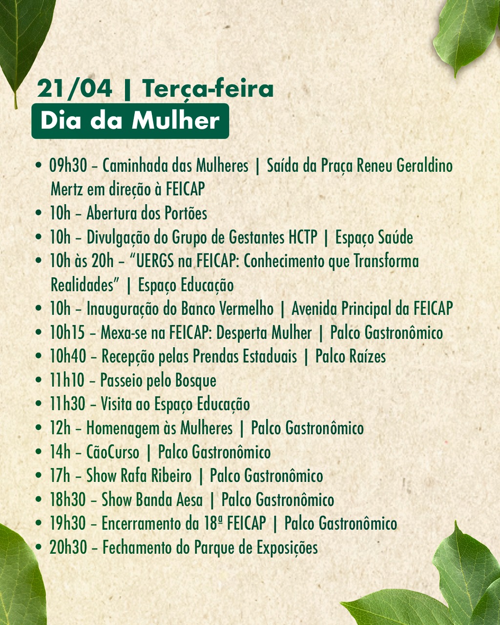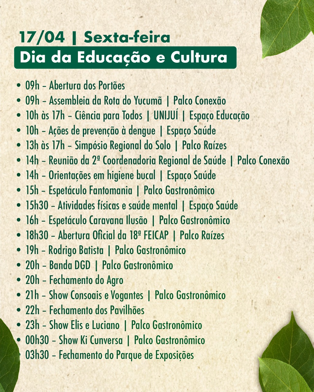 Nos dias seguintes, a FEICAP segue organizada por temáticas. A sexta-feira (17) será voltada à educação e cultura, com destaque para a abertura oficial do evento à noite. O sábado (18) foca no turismo, com painéis e apresentações artísticas. No domingo (19), as atividades são direcionadas à melhor idade, incluindo baile e atrações culturais.