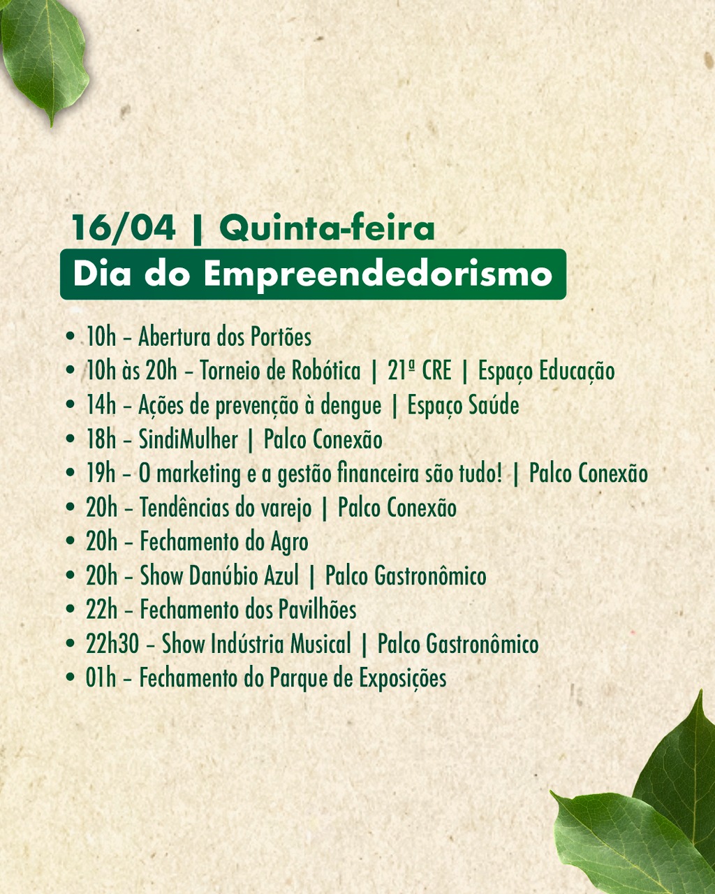 O primeiro dia é dedicado ao empreendedorismo. Entre os destaques estão o Torneio de Robótica, promovido pela 21ª Coordenadoria Regional de Educação, e ações de prevenção à dengue no Espaço Saúde. No período da noite, o Palco Conexão recebe debates sobre o papel das mulheres no empreendedorismo, marketing, gestão financeira e tendências do mercado, com participação de especialistas.
