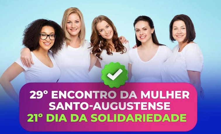 A Administração Municipal promove, nesta terça-feira, 03 de março, o 29º Encontro da Mulher Santo-Augustense e o 21º Dia da Solidariedade. O evento será realizado a partir das 13h, no CTG Pompílio Silva, em Santo Augusto, com programação voltada à valorização da mulher e ao fortalecimento da solidariedade no município.