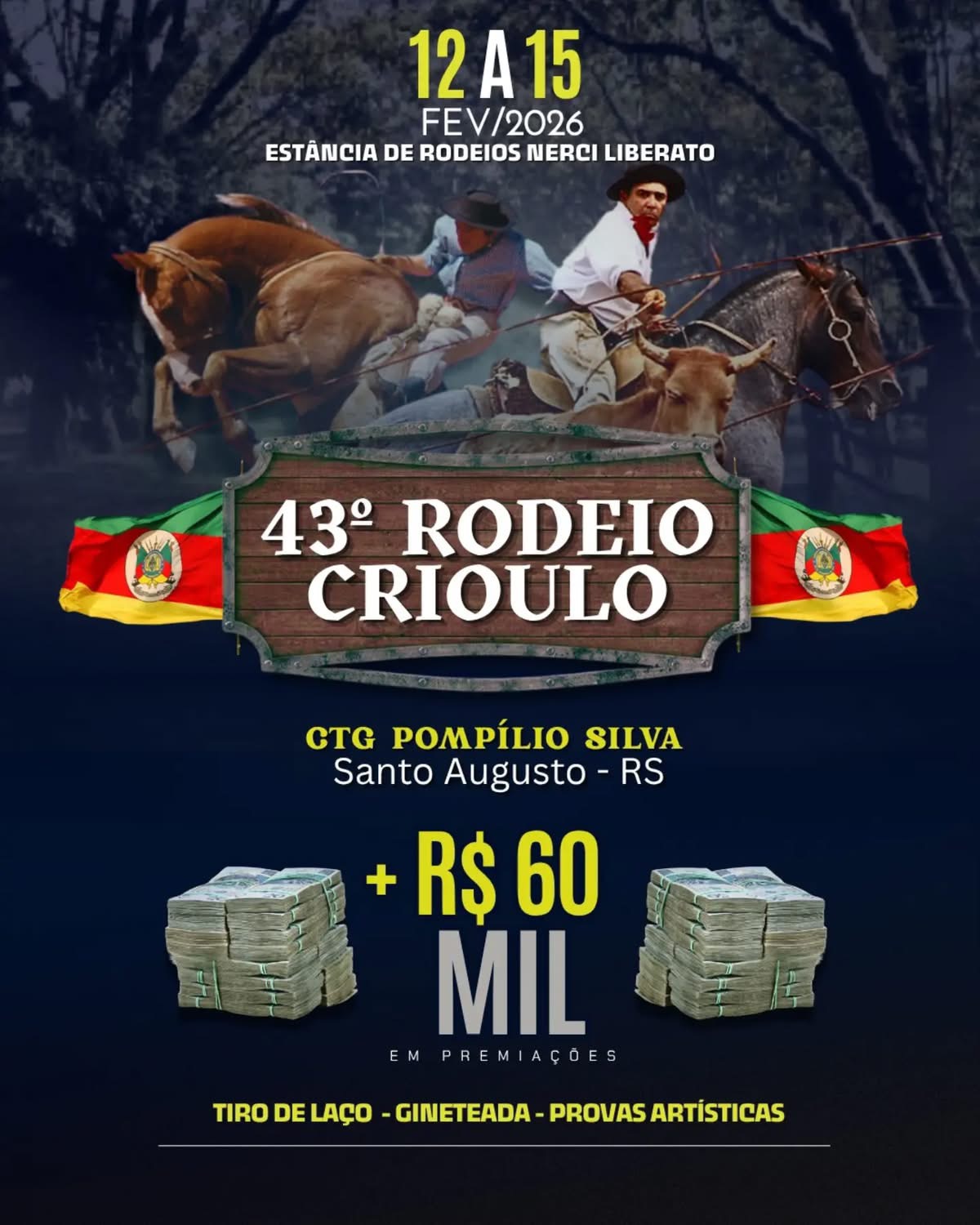 O CTG Pompílio Silva, de Santo Augusto, promove entre os dias 12 e 15 de fevereiro de 2026 o 43º Rodeio Crioulo, na Estância de Rodeios Nerci Liberato. O evento é um dos mais tradicionais da região e reúne competidores, artistas e o público em geral em uma extensa programação campeira, cultural e artística, com mais de R$ 60 mil em premiações.