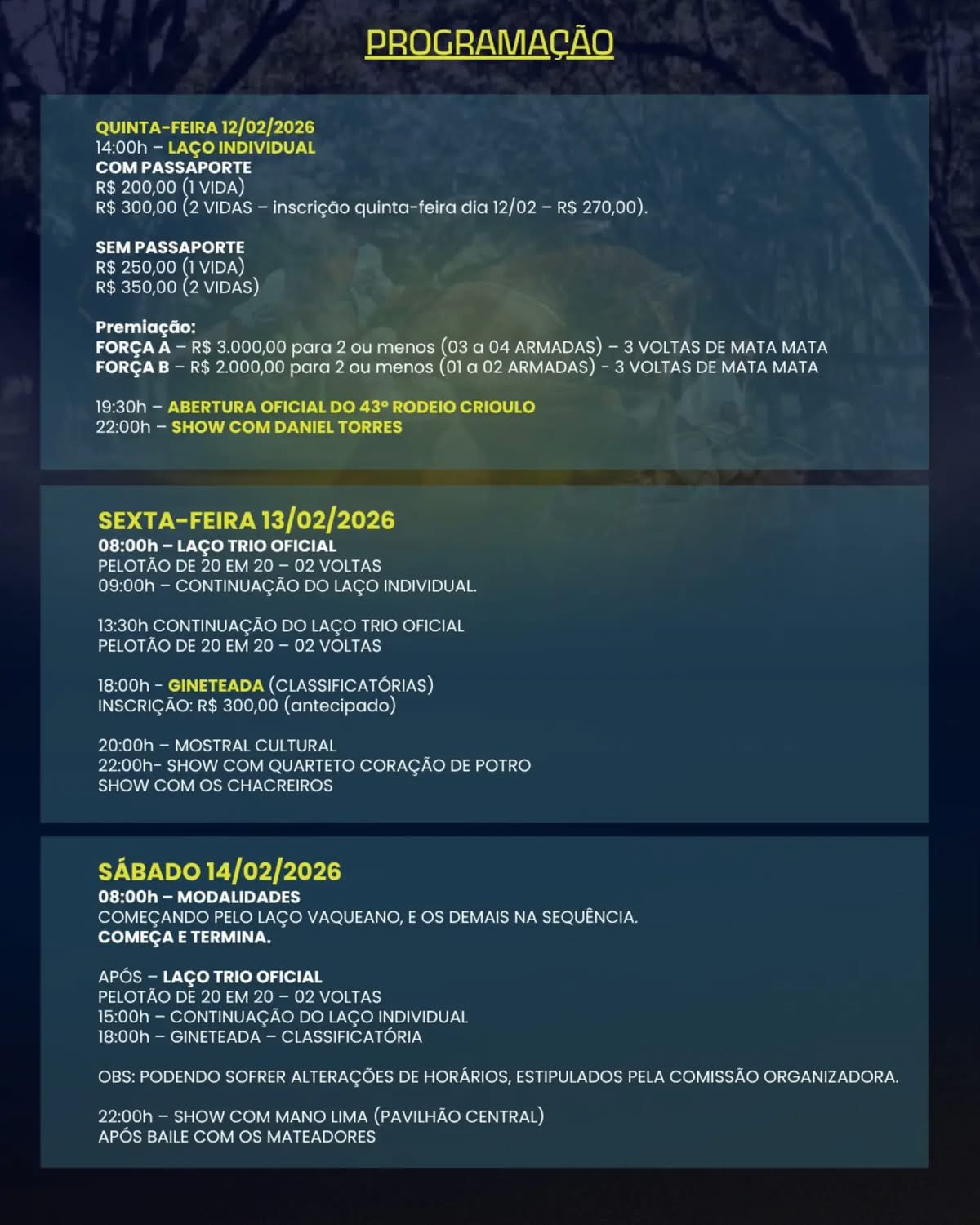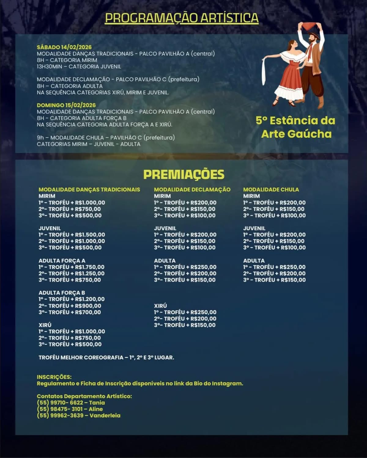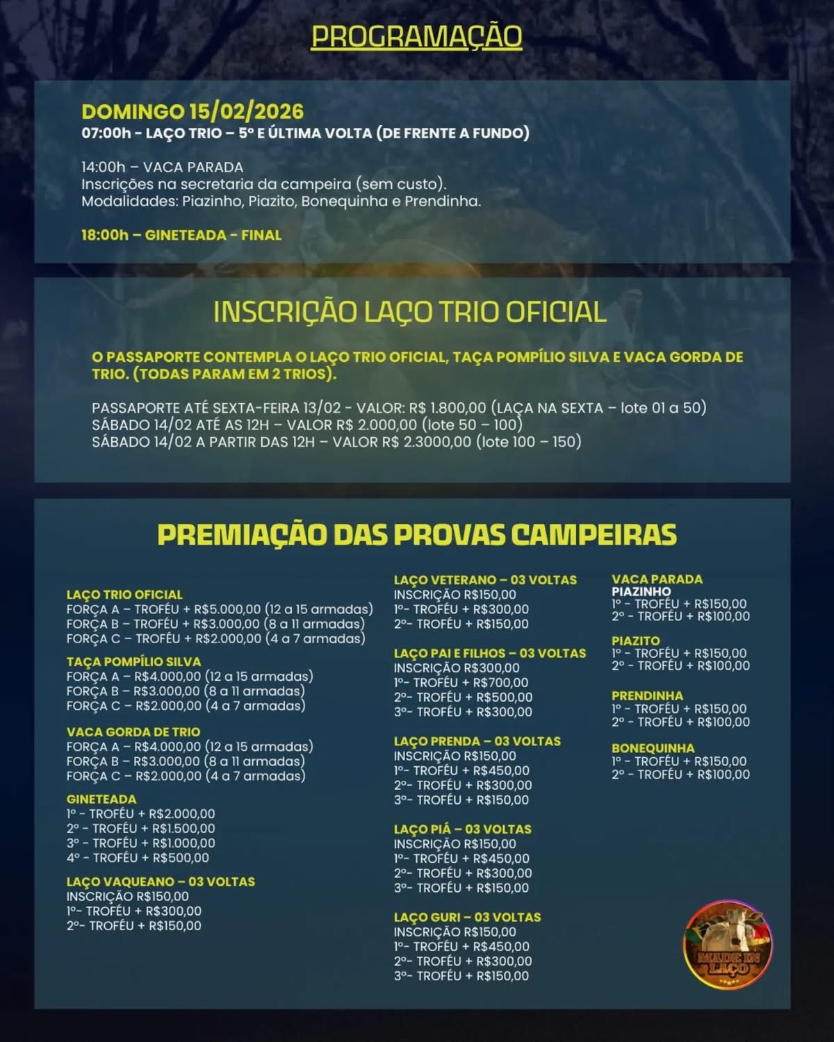 As inscrições para o laço trio oficial contam com diferentes valores conforme o lote e a data, e o passaporte inclui também a Taça Pompílio Silva e a Vaca Gorda de Trio. Já as inscrições para as modalidades artísticas e culturais estão disponíveis por meio do link na bio do Instagram do evento.