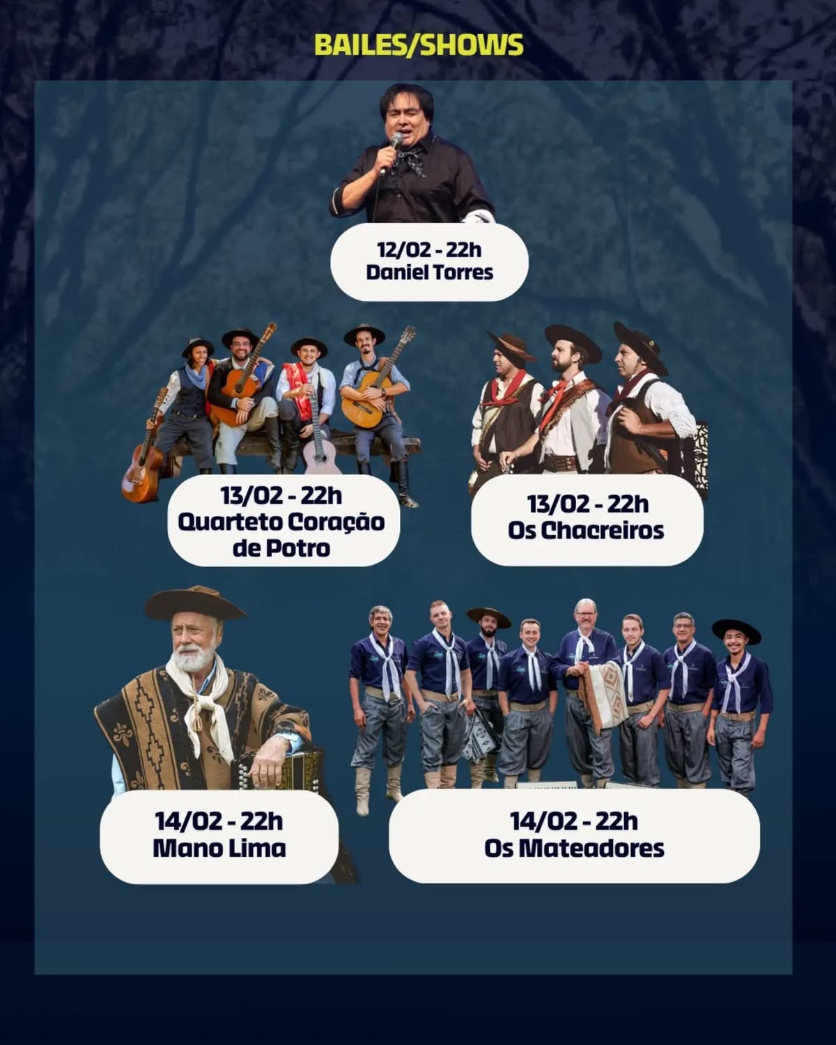 Na sexta-feira (13), a programação inicia logo pela manhã com o laço trio oficial, dando sequência às classificatórias da gineteada. O dia também será marcado por mostra cultural e shows com o Quarteto Coração de Potro e Os Chacreiros. Já no sábado (14), além das provas campeiras e da continuidade do laço trio e gineteada, ocorre o show com Mano Lima, seguido de baile com Os Mateadores, no pavilhão central.
