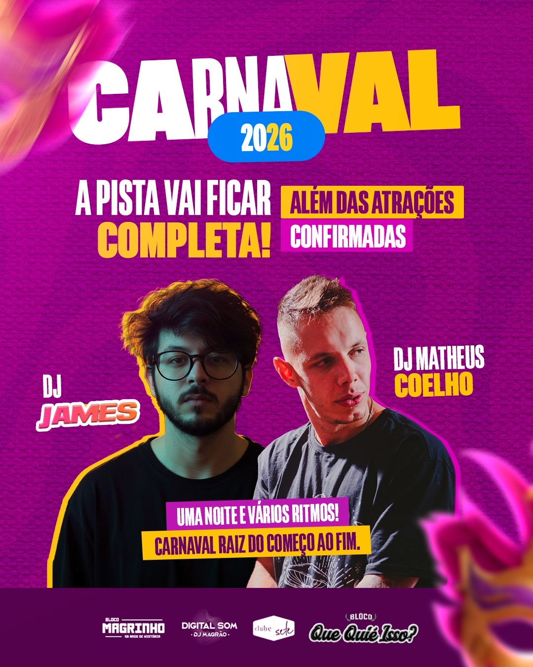 A abertura do Carnaval 2026 é uma realização do Clube 7, em parceria com a Digital Som DJ Magrão e os blocos Magrinho e Que Quié Isso?, reforçando a tradição carnavalesca do município e consolidando Santo Augusto como um dos polos de festa e cultura da Região Celeiro.