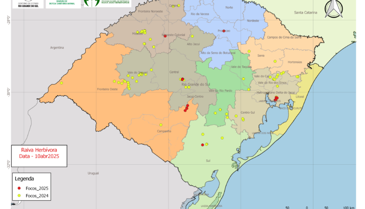 Neste ano de 2025, já foram registrados 15 focos em seis municípios, sendo 12 em bovinos, dois em equinos e um em ovino nos municípios de Coronel Barros, Porto Alegre, Silveira Martins, Caçapava do Sul, Piratini, Viamão e Passo Fundo. Em 2024, foram 78 focos registrados no Rio Grande do Sul em 40 municípios.