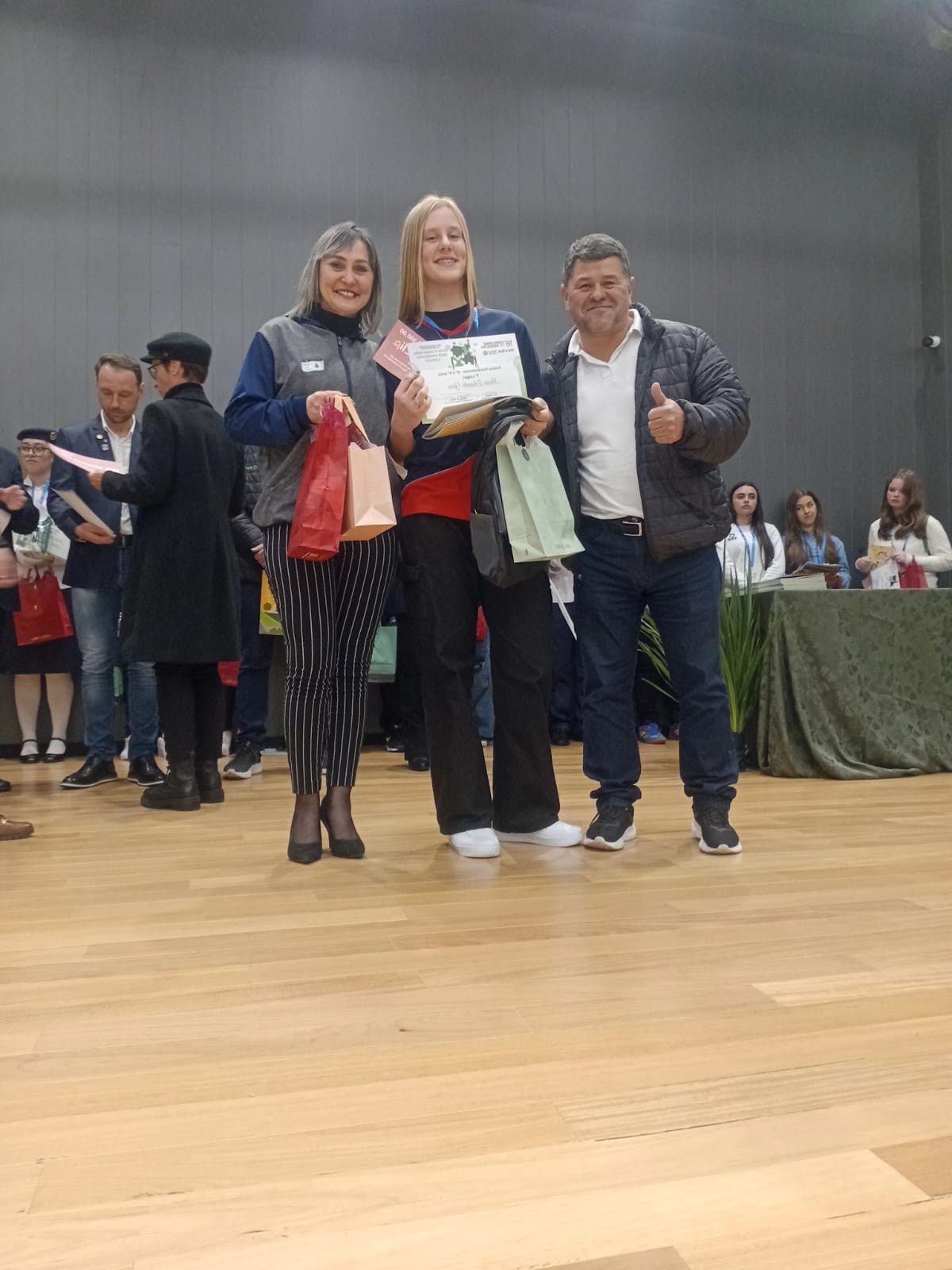 Como premiação, Maria Eduarda recebeu seis meses de um curso de inglês, um kit do Boticário, um vale-presente de R$ 300, medalha e certificado. Já a professora orientadora foi agraciada com um relógio, um kit do Boticário e um vale-presente de R$ 150.