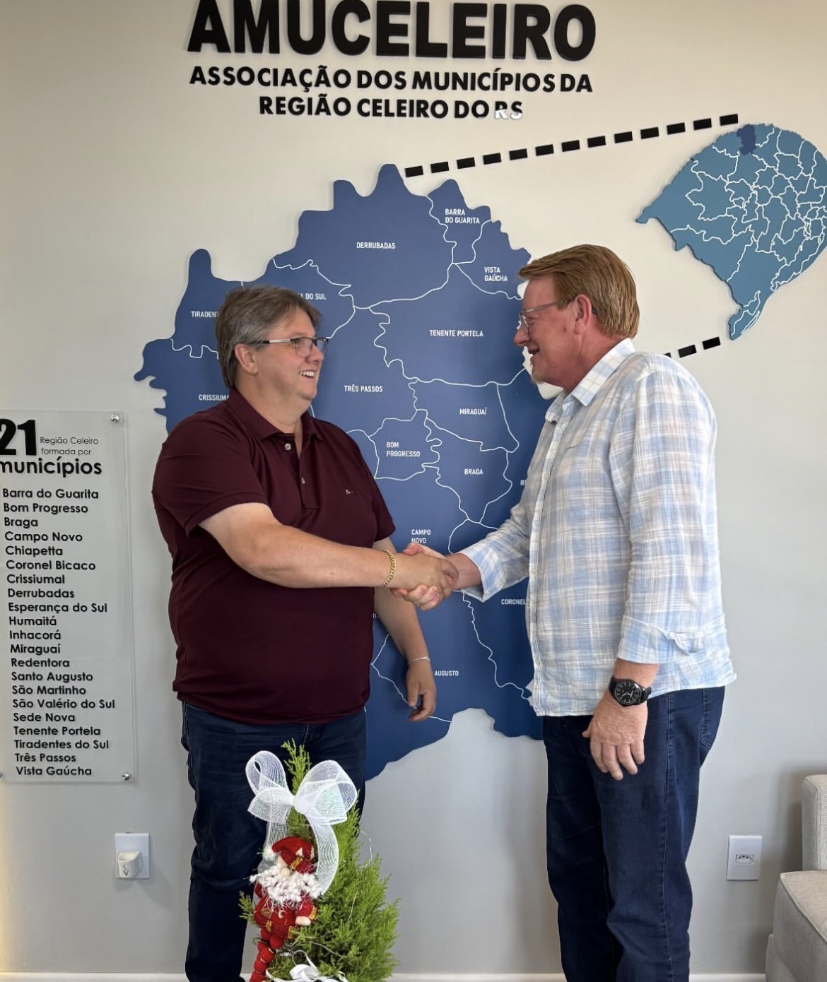 Na manhã desta quarta-feira (07), a Associação dos Municípios da Região Celeiro (AMUCELEIRO) realizou a transmissão de cargo da presidência. Na ocasião, o prefeito de Redentora, Malberk Antoine Kunst Dullius, transmitiu oficialmente o cargo de presidente da entidade ao prefeito de Bom Progresso, Norimar Schossler, que passa a comandar a AMUCELEIRO no novo período de gestão.