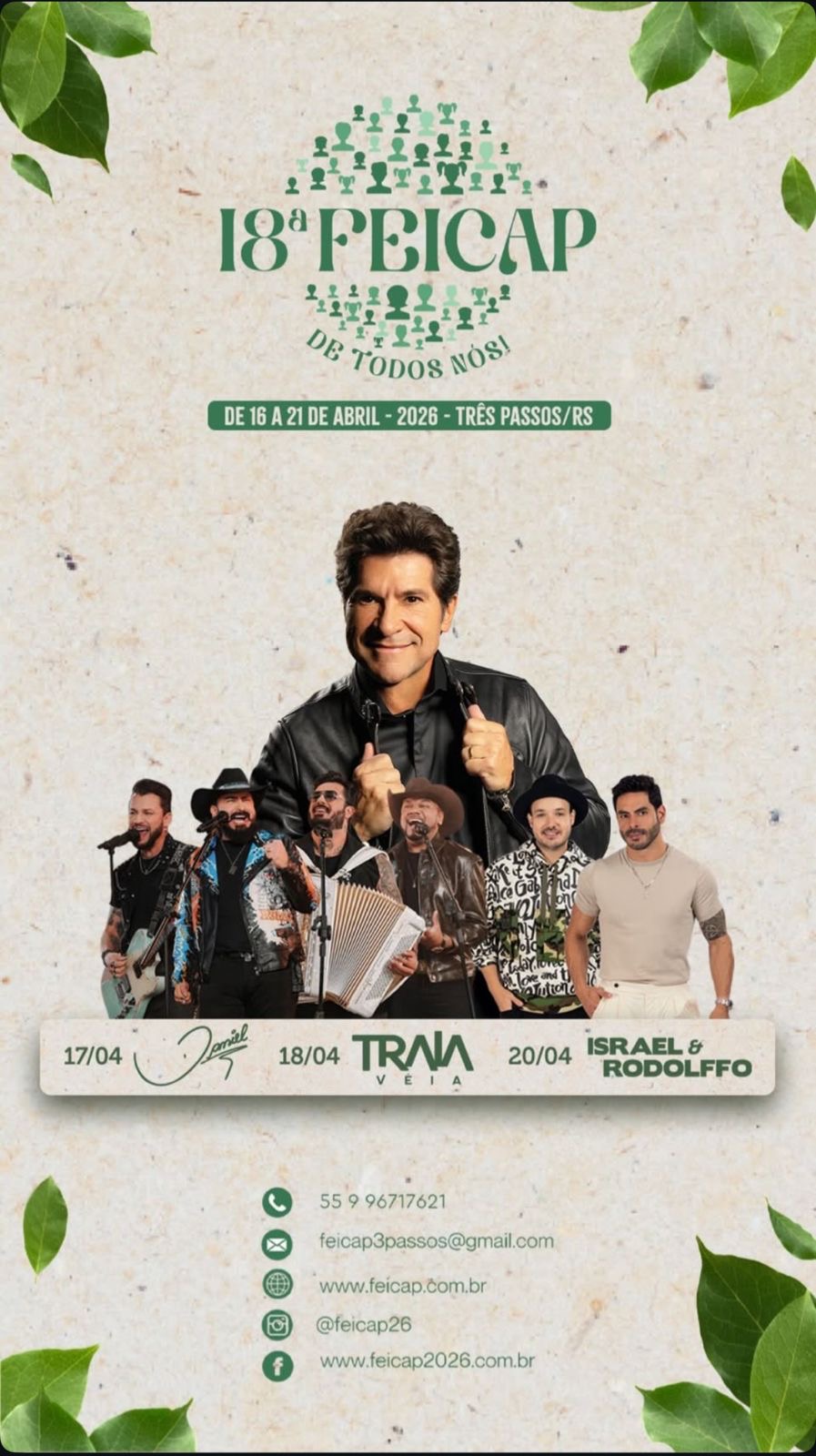- A 18ª Feira Exposição Industrial, Comercial e Agropecuária de Três Passos (Feicap) confirmou nesta terça-feira, 18 de novembro, as atrações musicais que irão animar o público na edição de 2026. O anúncio ocorreu durante a Coletiva de Lançamento realizada no Cine Globo, marcando oficialmente o início da contagem regressiva para o maior evento de Três Passos e região.