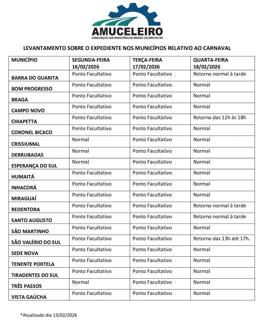 A Associação dos Municípios da Região Celeiro do RS (AMUCELEIRO) divulgou na sexta-feira, 13 de fevereiro, um levantamento sobre o expediente das prefeituras da região durante o feriadão de Carnaval.