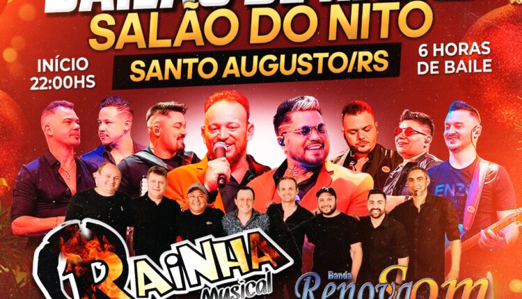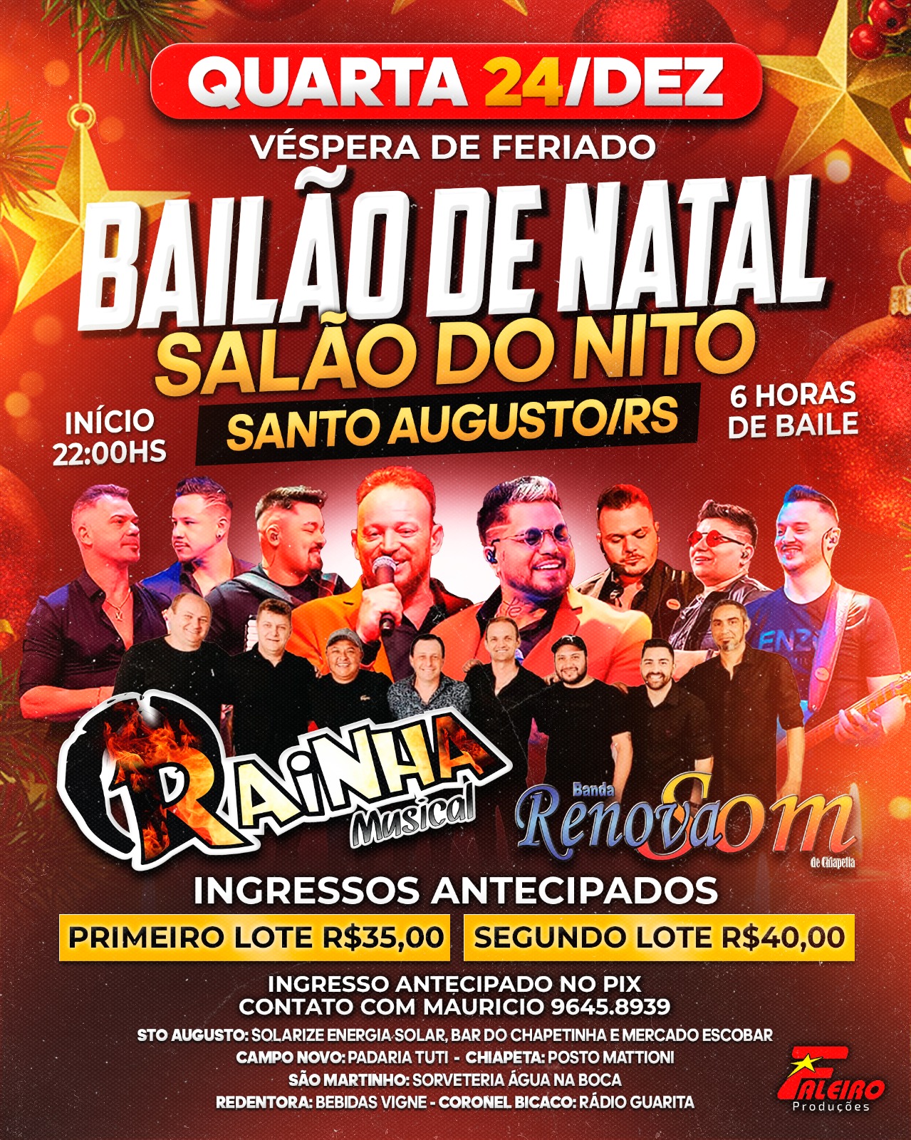 O Salão do Nito realiza nesta quarta-feira, dia 24 de dezembro, véspera de feriado, o grande Baile de Natal, em Santo Augusto, reunindo música, confraternização e diversão para o público da região. O evento é uma das atrações tradicionais do período natalino e promete uma noite especial para celebrar a data.