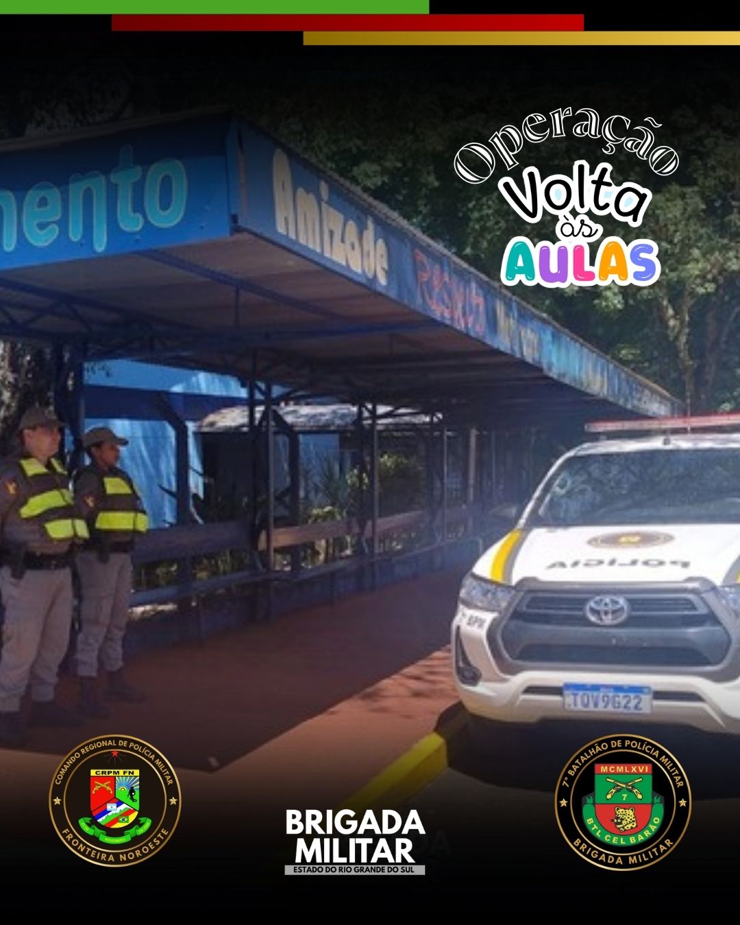 A Brigada Militar lançou nesta quarta-feira (18) a Operação Volta às Aulas 2026 nos 21 municípios atendidos pelo 7º BPM. A ação se estende até 18 de dezembro e tem como foco reforçar a segurança no entorno das escolas durante o período letivo.