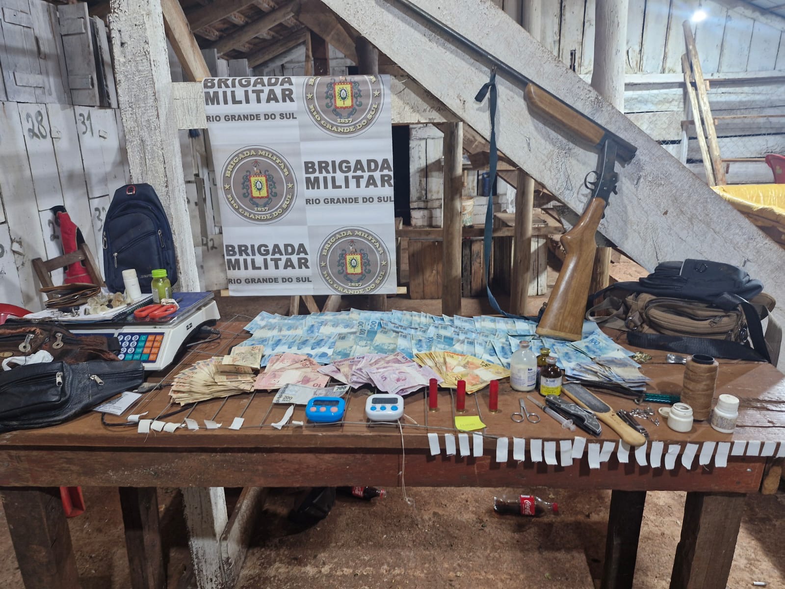 Entre os materiais recolhidos estão uma espingarda calibre 28 sem marca e sem numeração, três cartuchos — dois intactos e um deflagrado —, dois smartphones, uma balança de precisão, R$ 11.569 em dinheiro, 27 sacolas de transporte, um caderno de anotações e um conjunto de 88 itens usados para manipulação de animais, como seringas, medicamentos veterinários, biqueiras de aço e esporas.