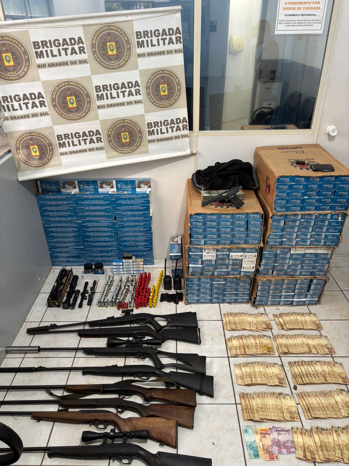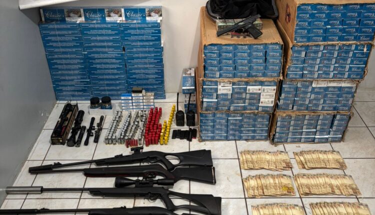 Durante as buscas no galpão e no veículo, os policiais encontraram um grande arsenal, incluindo diversas armas de fogo de diferentes calibres, algumas com supressores, além de rifles com luneta, pistola, espingardas, grande quantidade de munições, rádios comunicadores e acessórios. Também foram apreendidos mais de quatro mil maços de cigarros de origem estrangeira e uma mochila contendo uma quantia significativa de dinheiro.