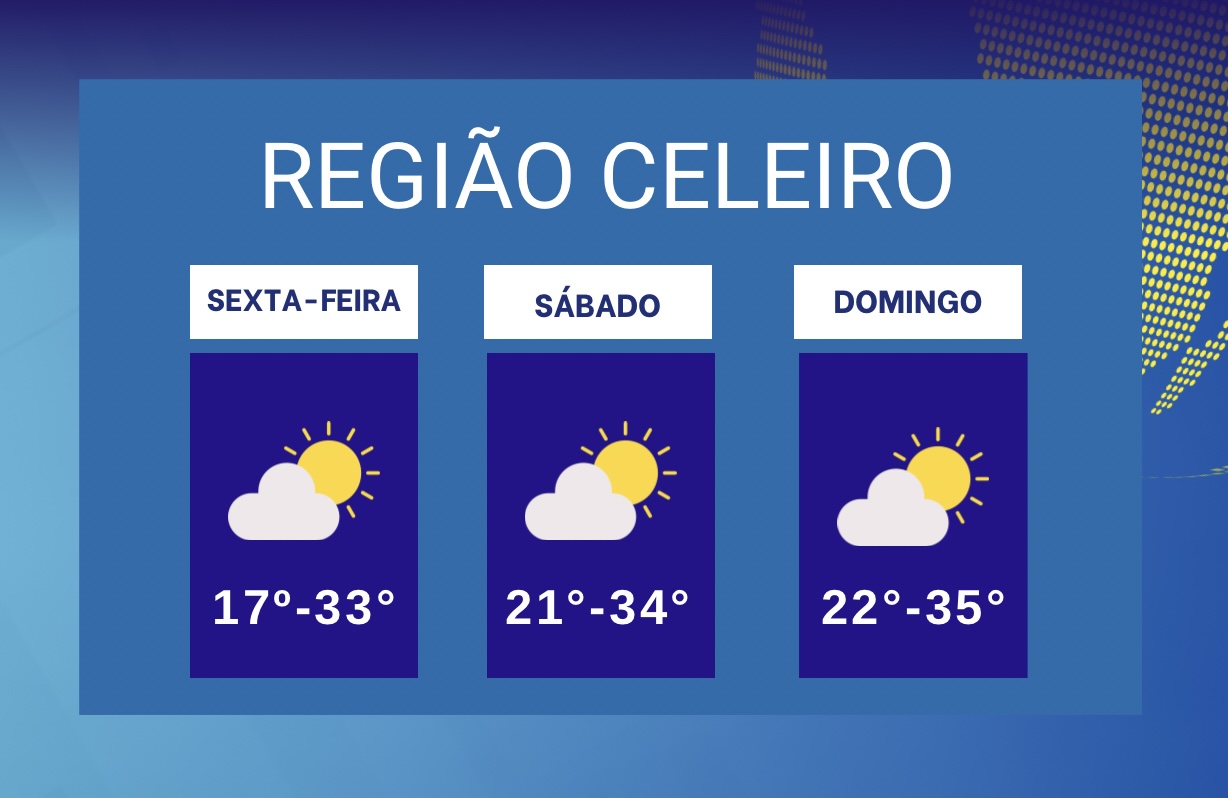 A sexta-feira começou com temperatura em torno dos 17 graus, mas ao longo do dia o calor ganha força, com os termômetros podendo atingir os 33 graus. A elevação nas temperaturas marca a tendência de um fim de semana de tempo firme e calor intenso na região.