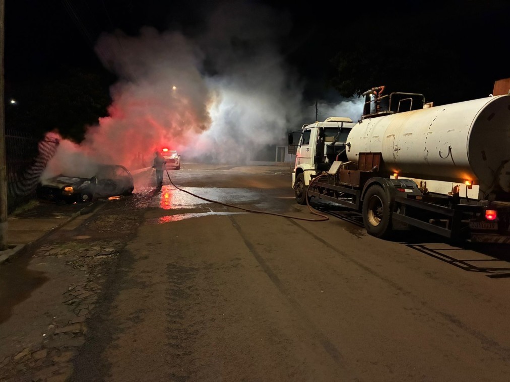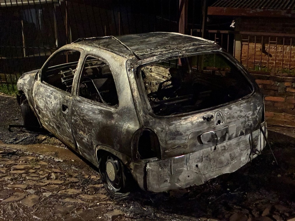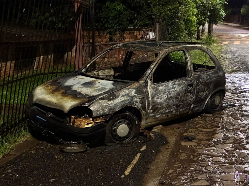 Por volta das 3 horas da madrugada, um veículo Chevrolet Corsa estava batido contra a grade de uma residência e em chamas na rua Mário Fucilini, no bairro Glória, em Santo Augusto.