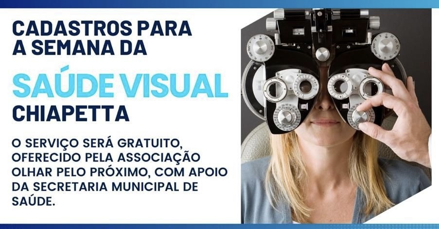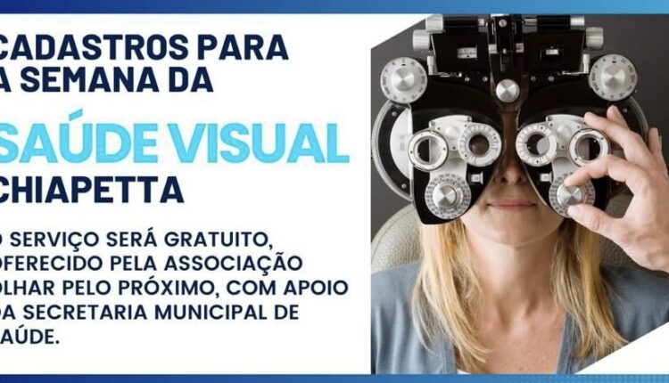 A Prefeitura de Chiapetta, por meio da Secretaria Municipal de Saúde, está realizando o cadastramento de moradores interessados em participar da Semana da Saúde Visual, iniciativa gratuita promovida pela Associação Olhar Pelo Próximo. As inscrições ocorrem nos dias 12, 13 e 14 de janeiro, na Academia da Saúde.