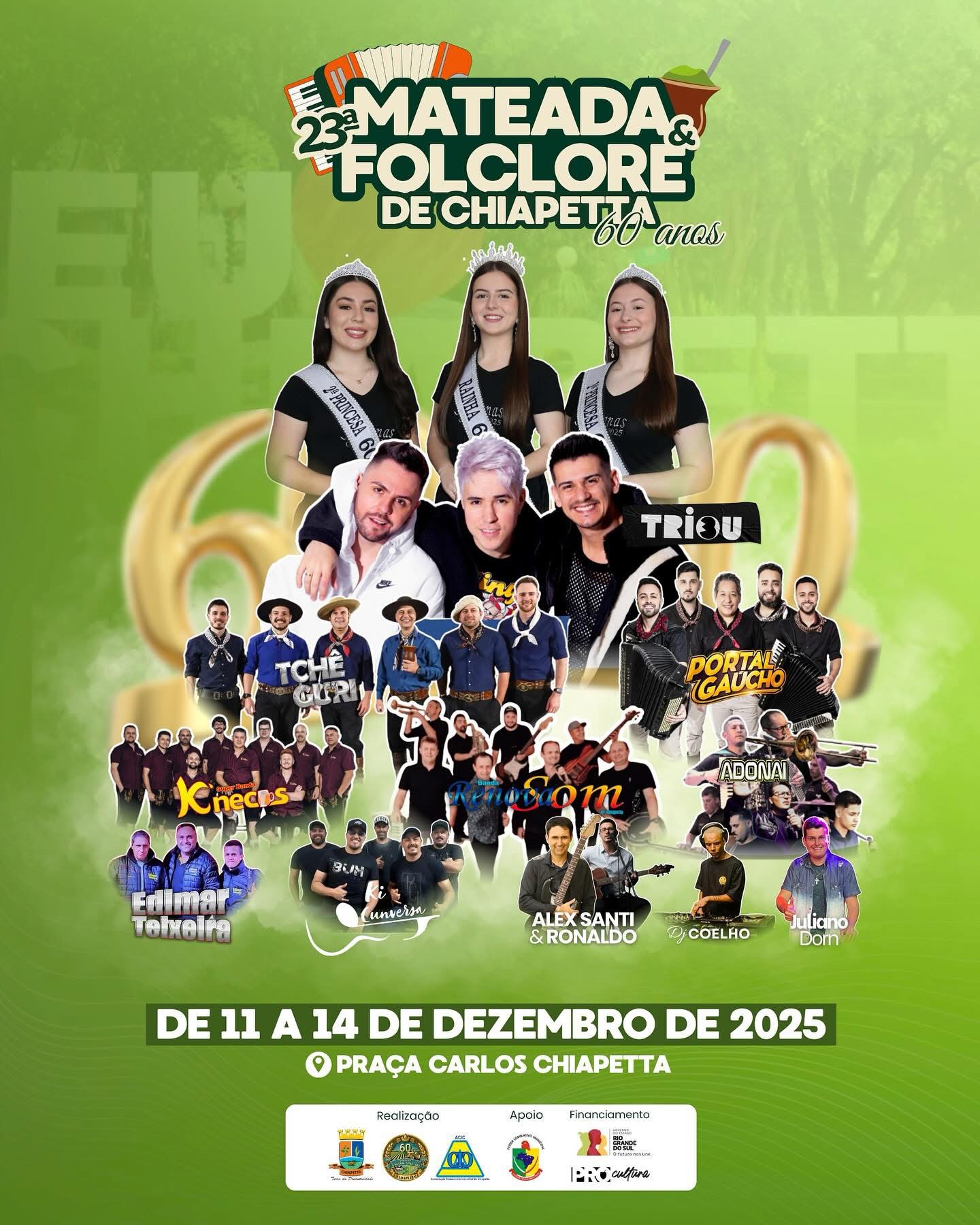 A Praça Carlos Chiapetta será novamente o centro das atenções entre os dias 11 e 14 de dezembro, quando ocorre a 23ª edição da Mateada & Folclore, evento que marca o calendário cultural do município e, neste ano, integra também as comemorações pelos 60 anos de Chiapetta. A programação reúne música, manifestações tradicionais, integração comunitária e atrativos para todas as idades.