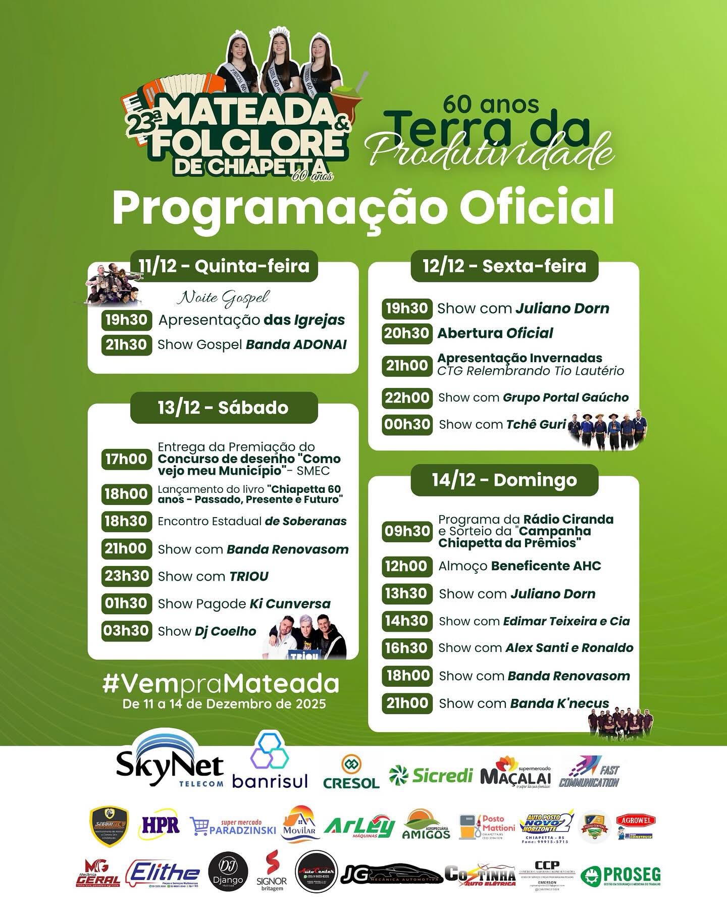 Com a proposta de valorizar a cultura local e promover encontros entre moradores e visitantes, a Mateada & Folclore se consolida como um dos principais símbolos da história e da identidade de Chiapetta. A expectativa é de grande público ao longo dos quatro dias de celebração.
