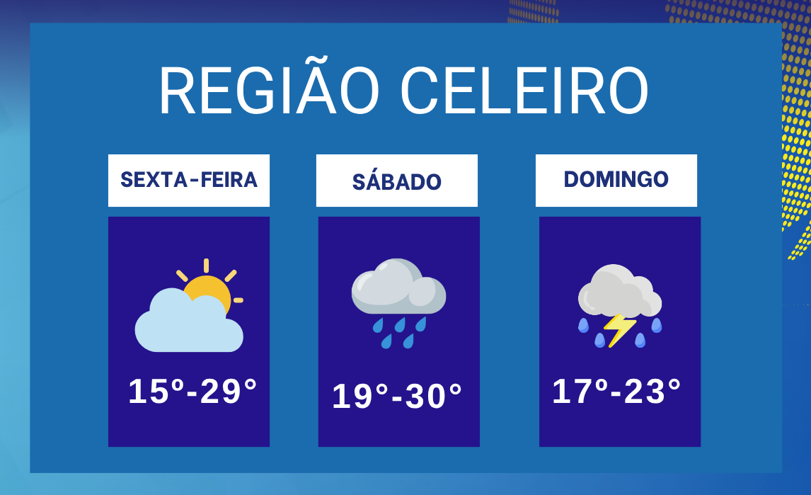 A sexta-feira (24) marca o início de um fim de semana de tempo instável na região. Segundo a previsão meteorológica, o dia será de temperaturas entre 15°C e 29°C, com céu parcialmente nublado e formação de nuvens mais carregadas ao longo da tarde e da noite.