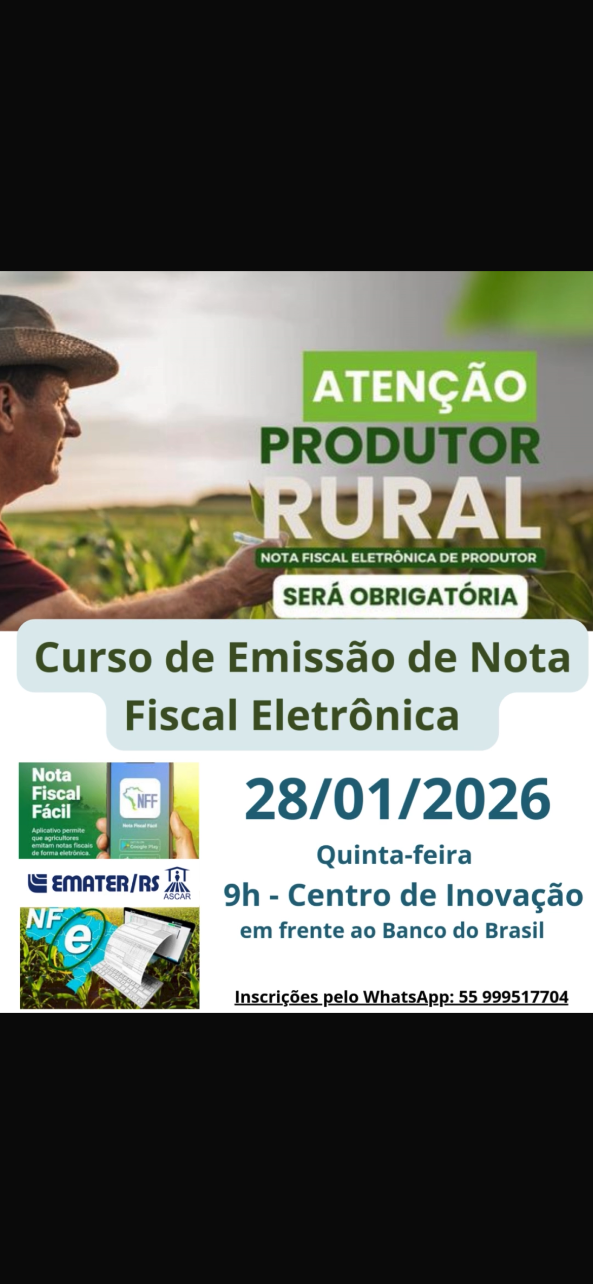 A Emater/RS-Ascar, com apoio da Prefeitura Municipal de Santo Augusto, promove no dia 28 de janeiro de 2026 um Curso de Emissão de Nota Fiscal Eletrônica de Produtor Rural, voltado a agricultores e produtores do município e da região.