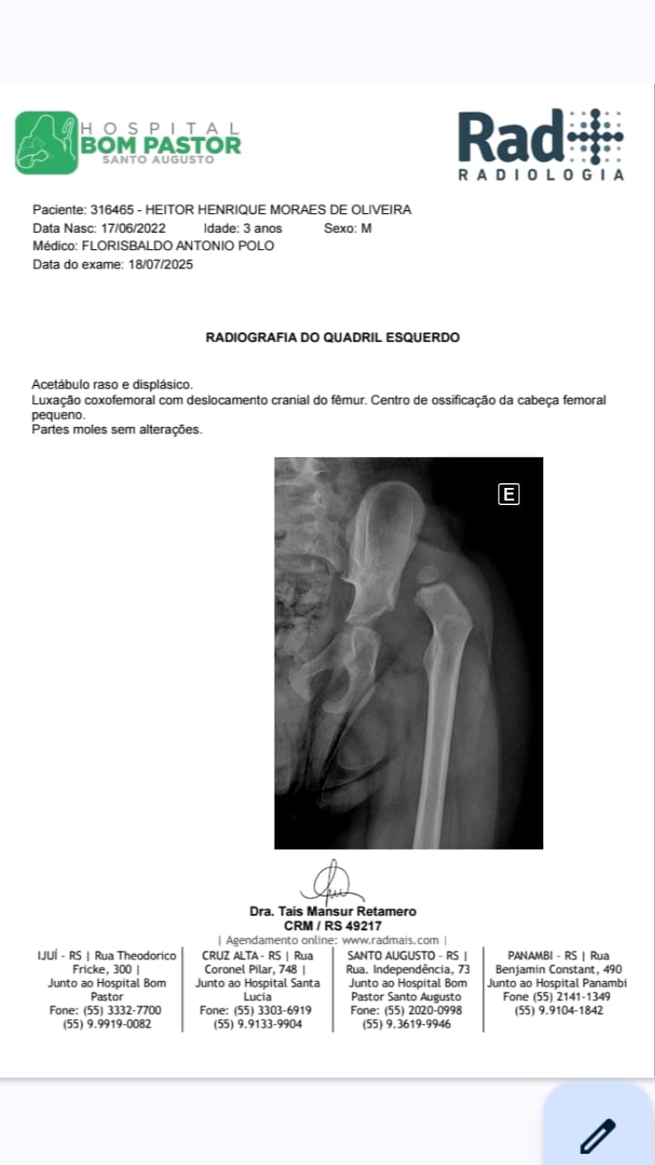 “Desde a primeira consulta em Santo Ângelo, a ortopedista nos disse que seria necessária uma cirurgia. Ficamos na fila do SUS, mas graças a Deus conseguimos adiantar o procedimento devido à urgência, pois a situação poderia piorar conforme ele crescesse,” relatou.