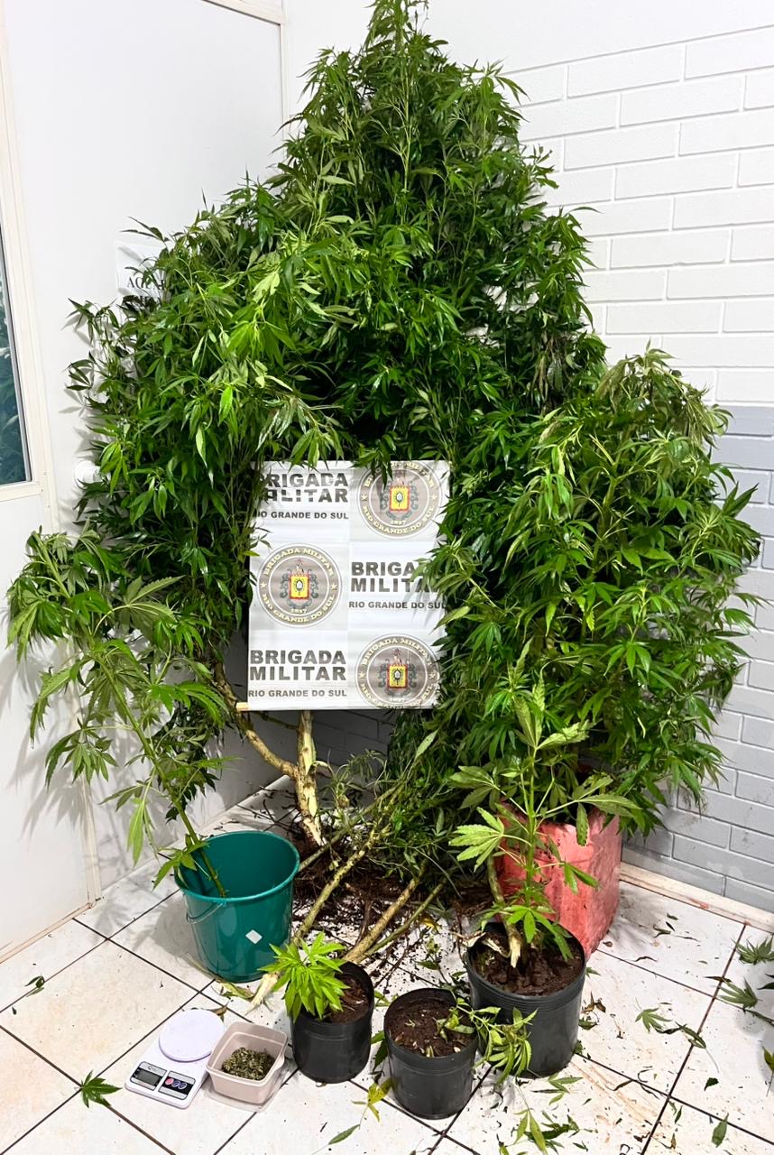 De acordo com a Brigada Militar, durante a abordagem e diligências realizadas, os policiais localizaram seis plantas de maconha, além de um recipiente contendo aproximadamente 10 gramas da droga já pronta para consumo. No local, também foi apreendida uma balança de precisão, objeto comumente utilizado para a pesagem de entorpecentes.