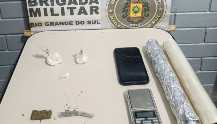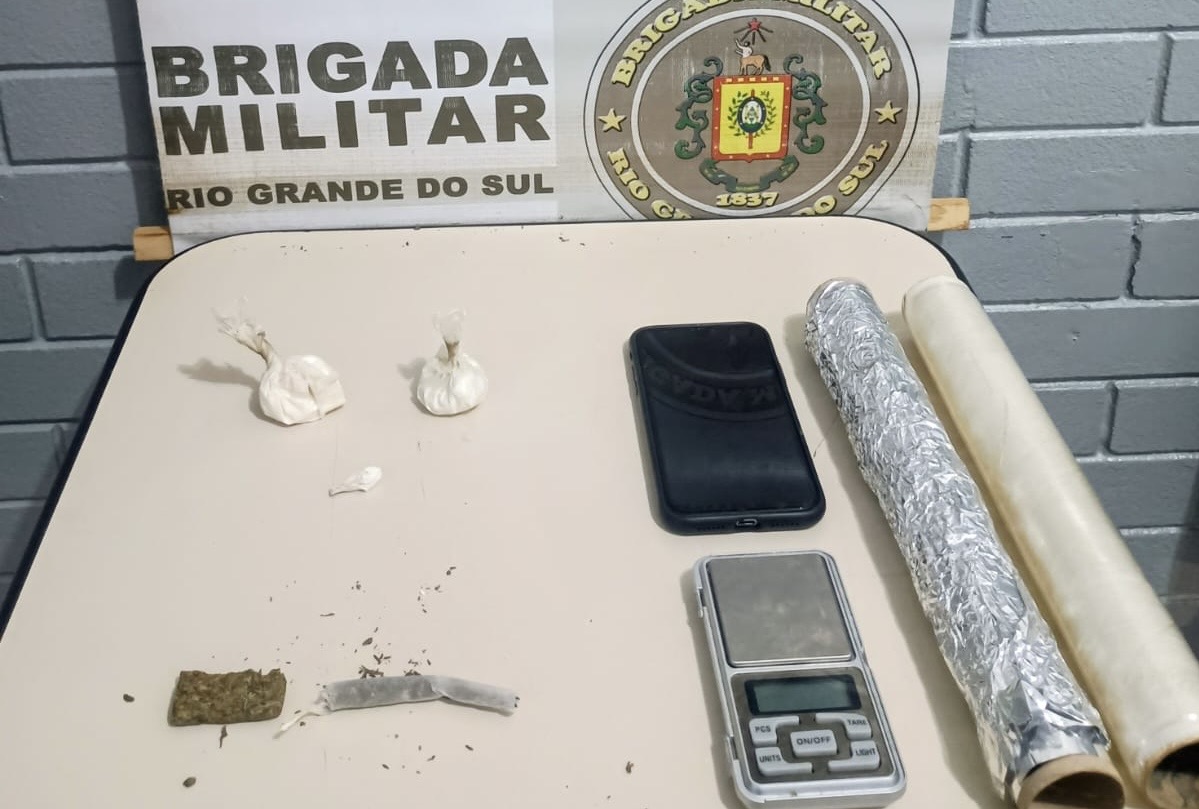 Além dos entorpecentes, os policiais localizaram uma balança de precisão, materiais utilizados para fracionamento e embalagem das drogas — como plástico filme e papel alumínio — e um aparelho celular.
