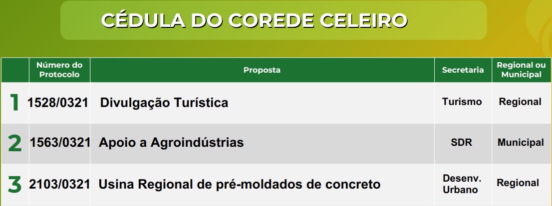 Neste ano, a cédula do Corede Celeiro apresenta três propostas, e as duas mais votadas serão contempladas com recursos do Governo do Estado. As opções são: Divulgação Turística, vinculada à Secretaria de Turismo; Apoio a Agroindústrias, da Secretaria de Desenvolvimento Rural; e Usina Regional de Pré-moldados de Concreto, proposta pela Secretaria de Desenvolvimento Urbano.