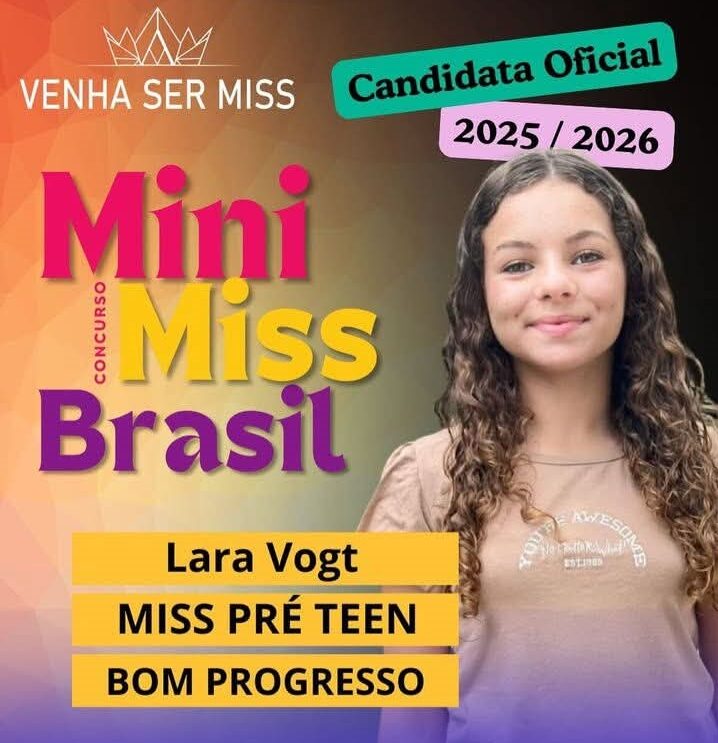 A jovem Lara Rafaela Vogt, de 11 anos, está representando o município de Bom Progresso no concurso Miss Brasil Pré Teen. Na última quarta-feira, 15 de outubro, Lara concluiu mais uma etapa da competição e seguirá sendo avaliada até o dia 10 de novembro, quando acontece a próxima fase. A grande final está marcada para o dia 10 de dezembro.