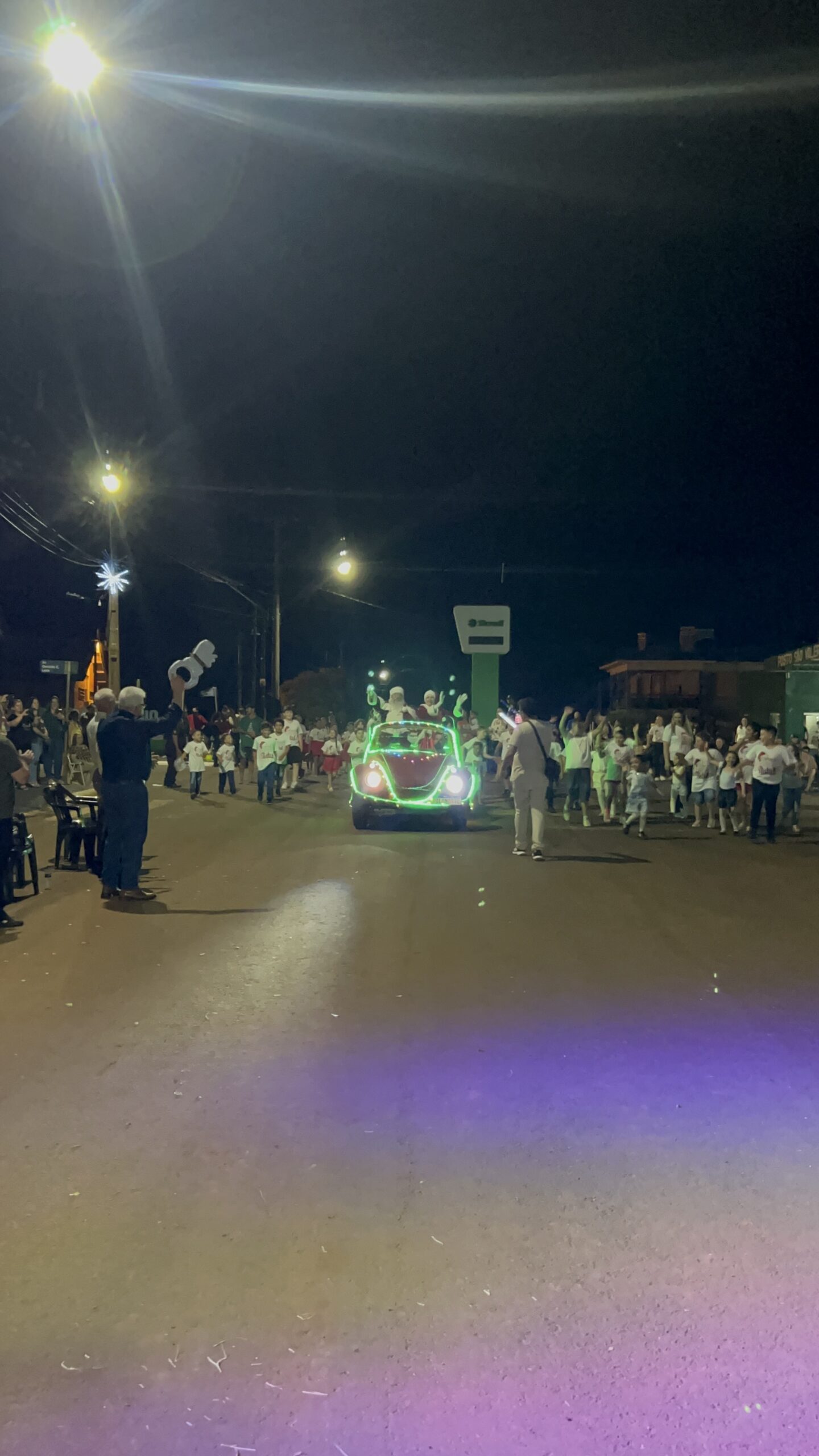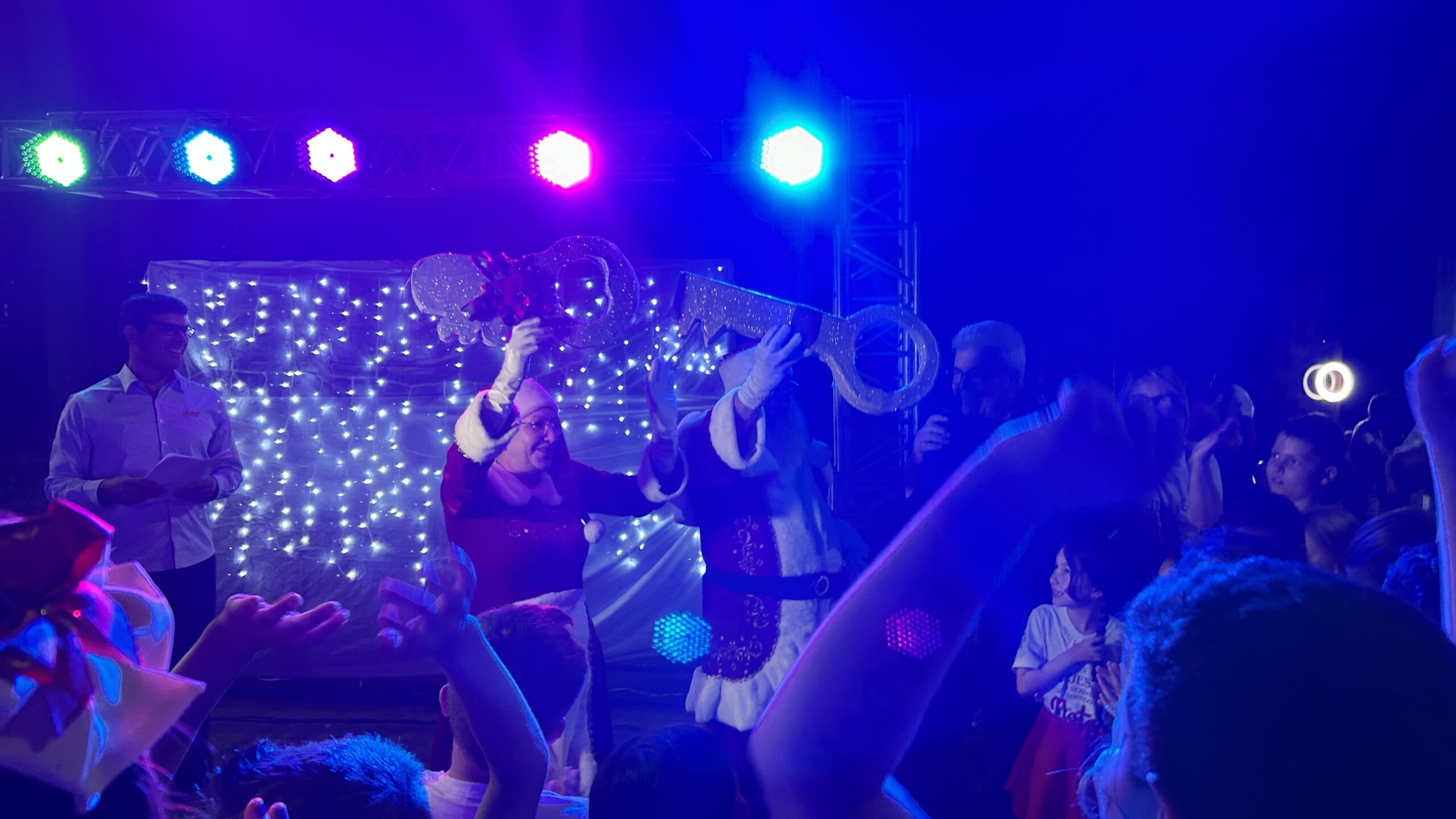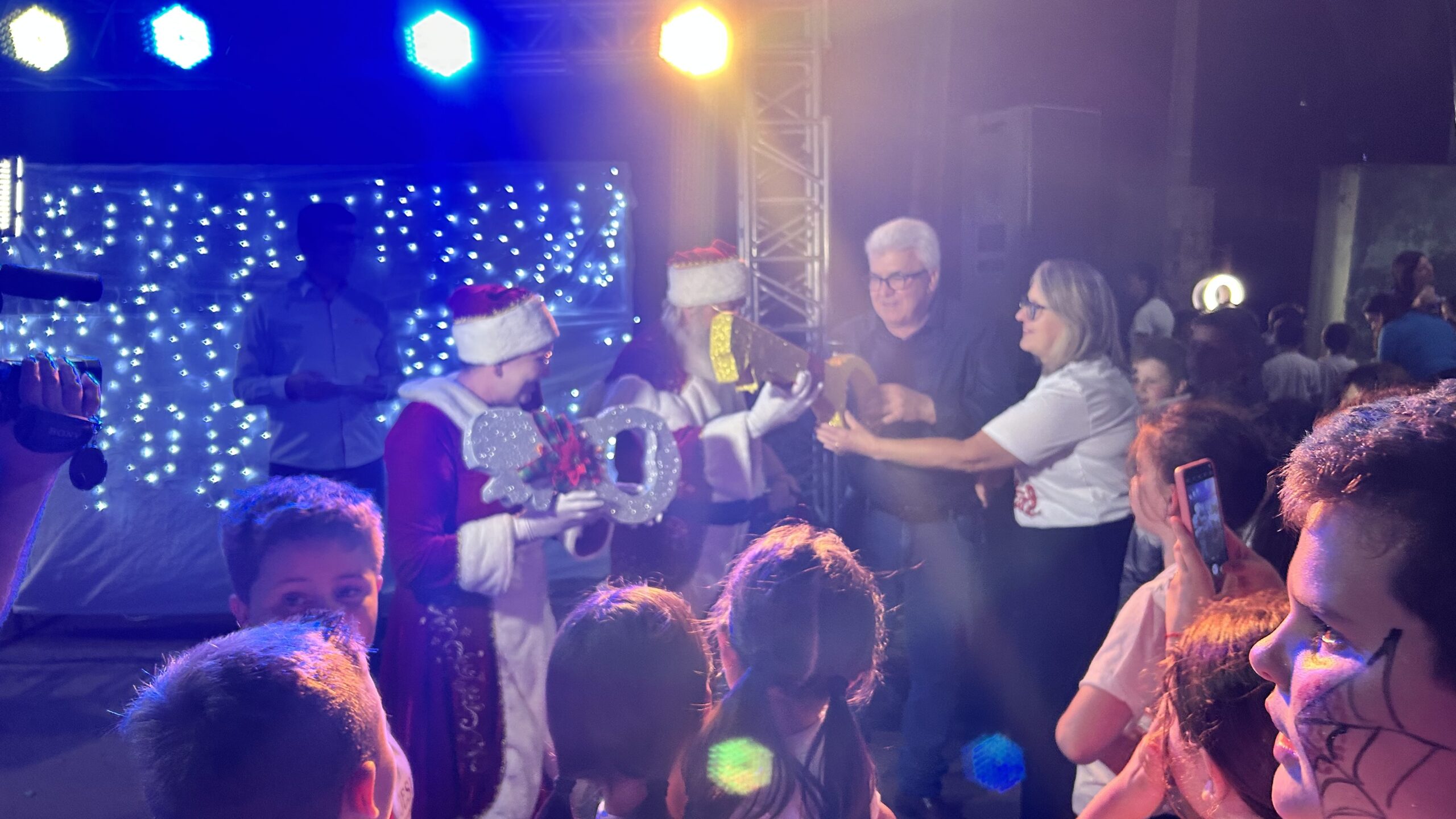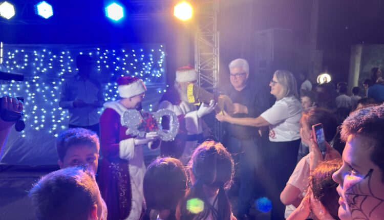 Um dos momentos mais aguardados da noite foi a chegada do Papai e da Mamãe Noel, recebidos com aplausos, sorrisos e muita emoção, especialmente pelas crianças. O momento simbolizou a magia do Natal e reforçou o espírito de alegria e confraternização entre as famílias presentes.