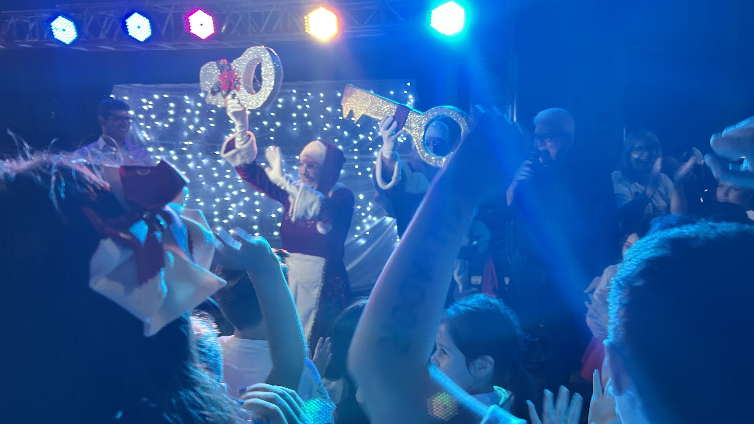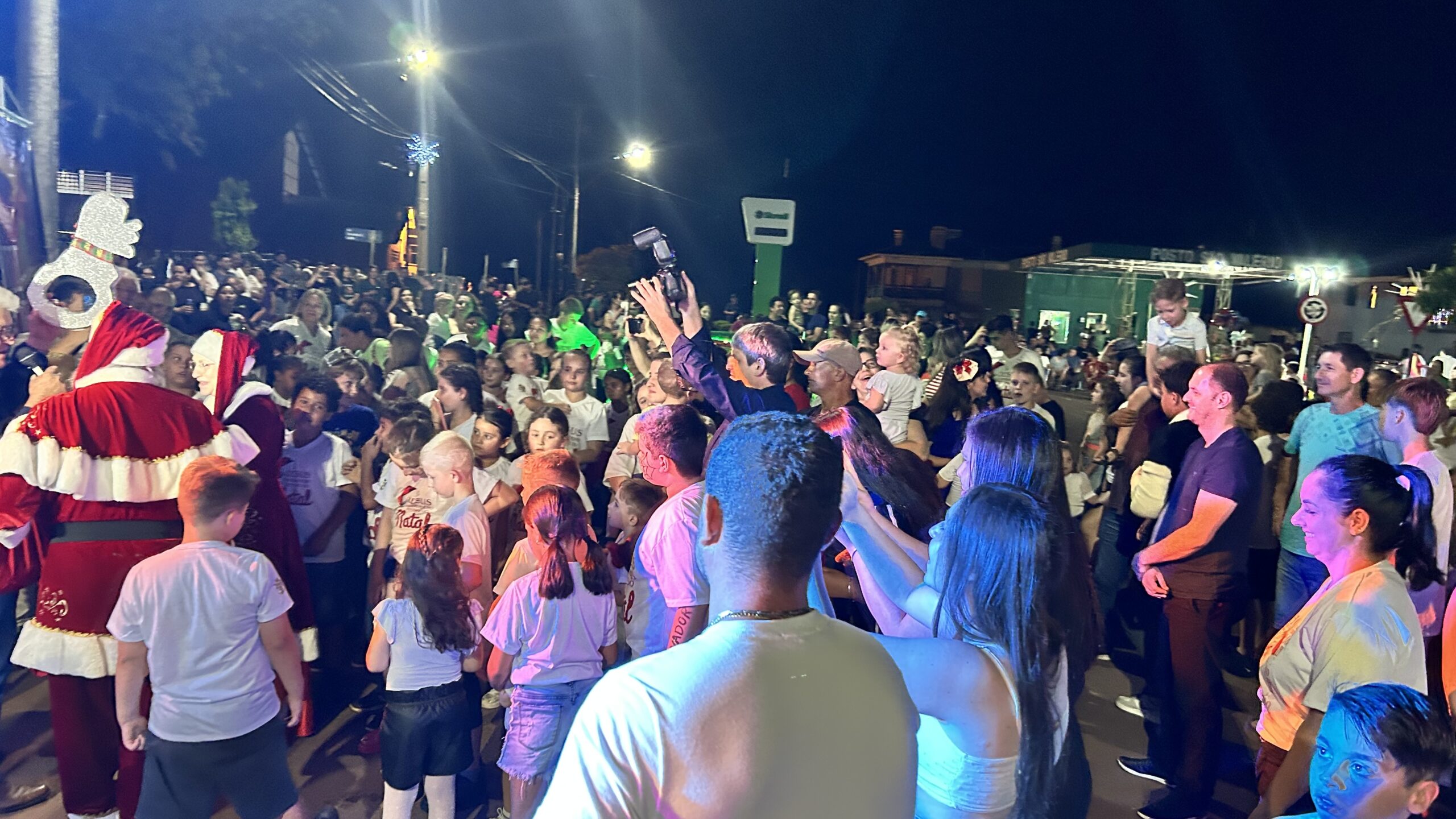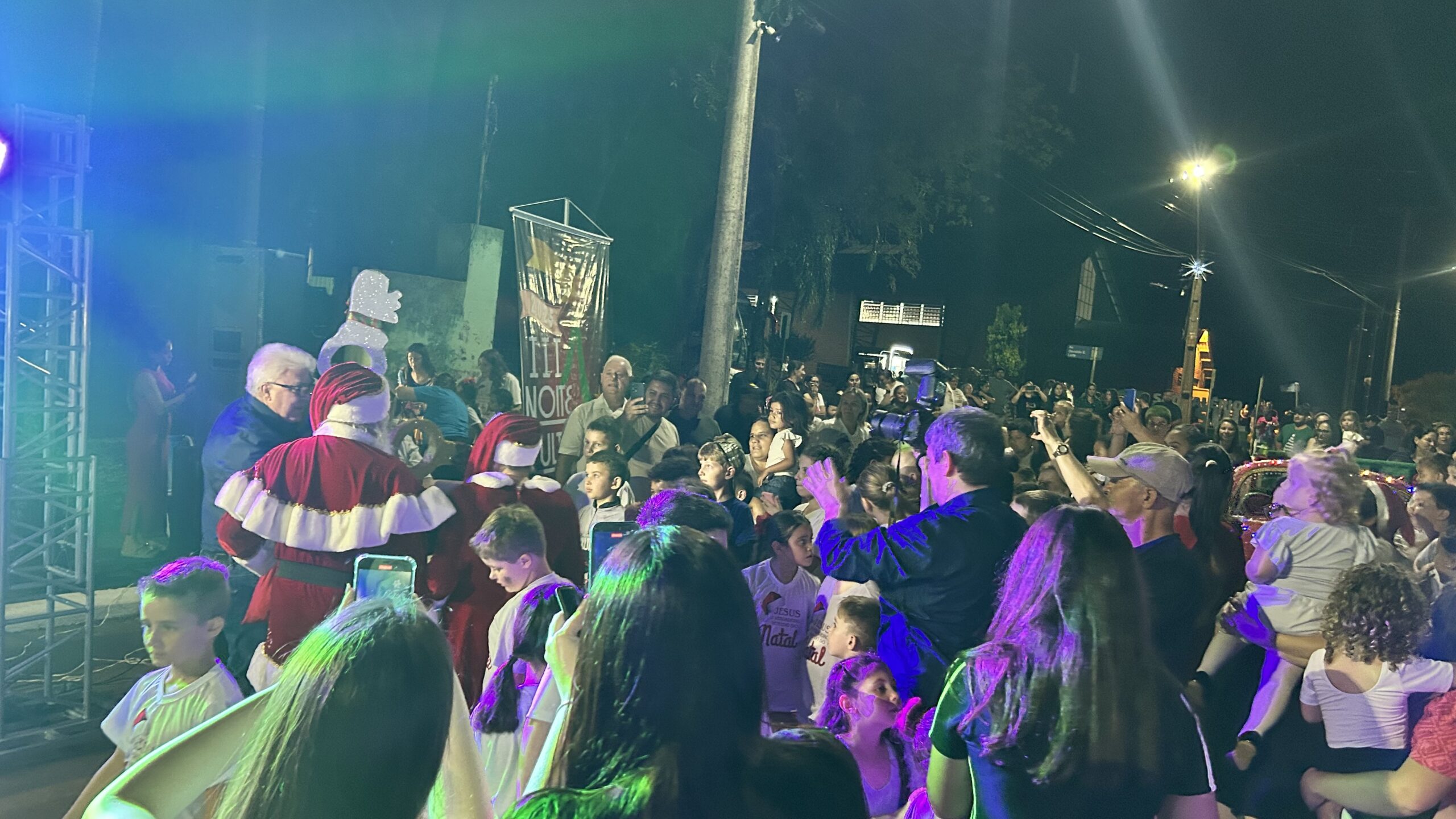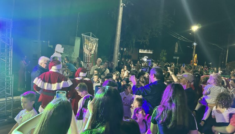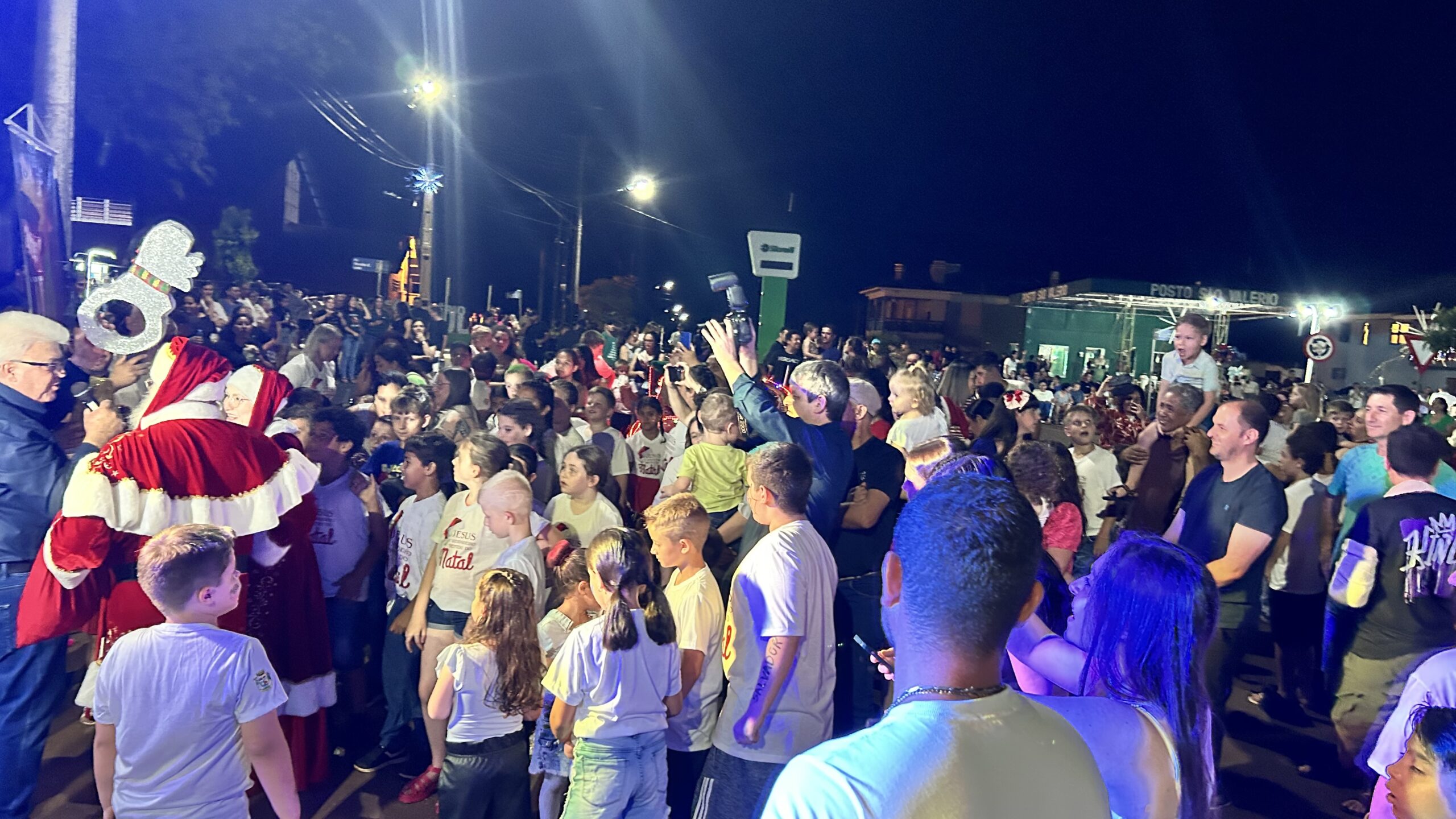 Um dos momentos mais aguardados da noite foi a chegada do Papai e da Mamãe Noel, recebidos com aplausos, sorrisos e muita emoção, especialmente pelas crianças. O momento simbolizou a magia do Natal e reforçou o espírito de alegria e confraternização entre as famílias presentes.