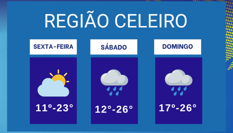 Para o sábado, 1º de novembro, a previsão indica mudança nas condições do tempo, com possibilidade de chuva entre a tarde e a noite, variando entre 5 e 10 milímetros. As temperaturas seguem em elevação, com mínima de 12 e máxima de 26 graus.