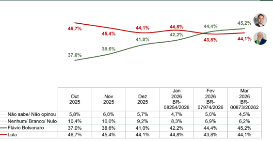De acordo com a pesquisa, esta é a segunda vez que o senador registra vantagem numérica sobre o presidente em levantamentos recentes. Em comparação com o estudo anterior, realizado em fevereiro, houve uma leve ampliação dessa diferença. Na ocasião, Flávio tinha 44,4% contra 43,8% de Lula — uma distância de 0,6 ponto percentual. Agora, o intervalo passou para 1,1 ponto, ainda considerado insuficiente para indicar vantagem consolidada.