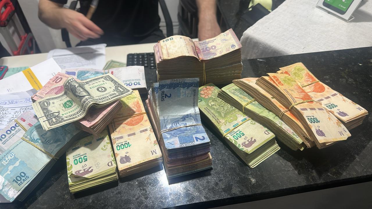 Durante o cumprimento das ordens judiciais, os agentes apreenderam valores em reais e pesos argentinos, garrafas de vinho de origem estrangeira e outros materiais considerados relevantes para as investigações.