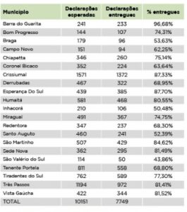 No âmbito da Região Celeiro, até o fechamento desta edição, cerca de 75% das declarações esperadas já haviam sido feitas, ou seja, das 10.151 documentações aguardadas, 7.749 já haviam cumprido com a sua obrigação. Entre os 21 municípios do concerto regional, apenas oito apresentam mais de 80% das declarações entregues, tendo o município de Barra do Guarita, com 96,68%. Por outro lado, os menores índices são observados em São Valério do Sul (43,86%); Inhacorá (50,48%), Santo Augusto (52,39%) e Braga (53,63%).