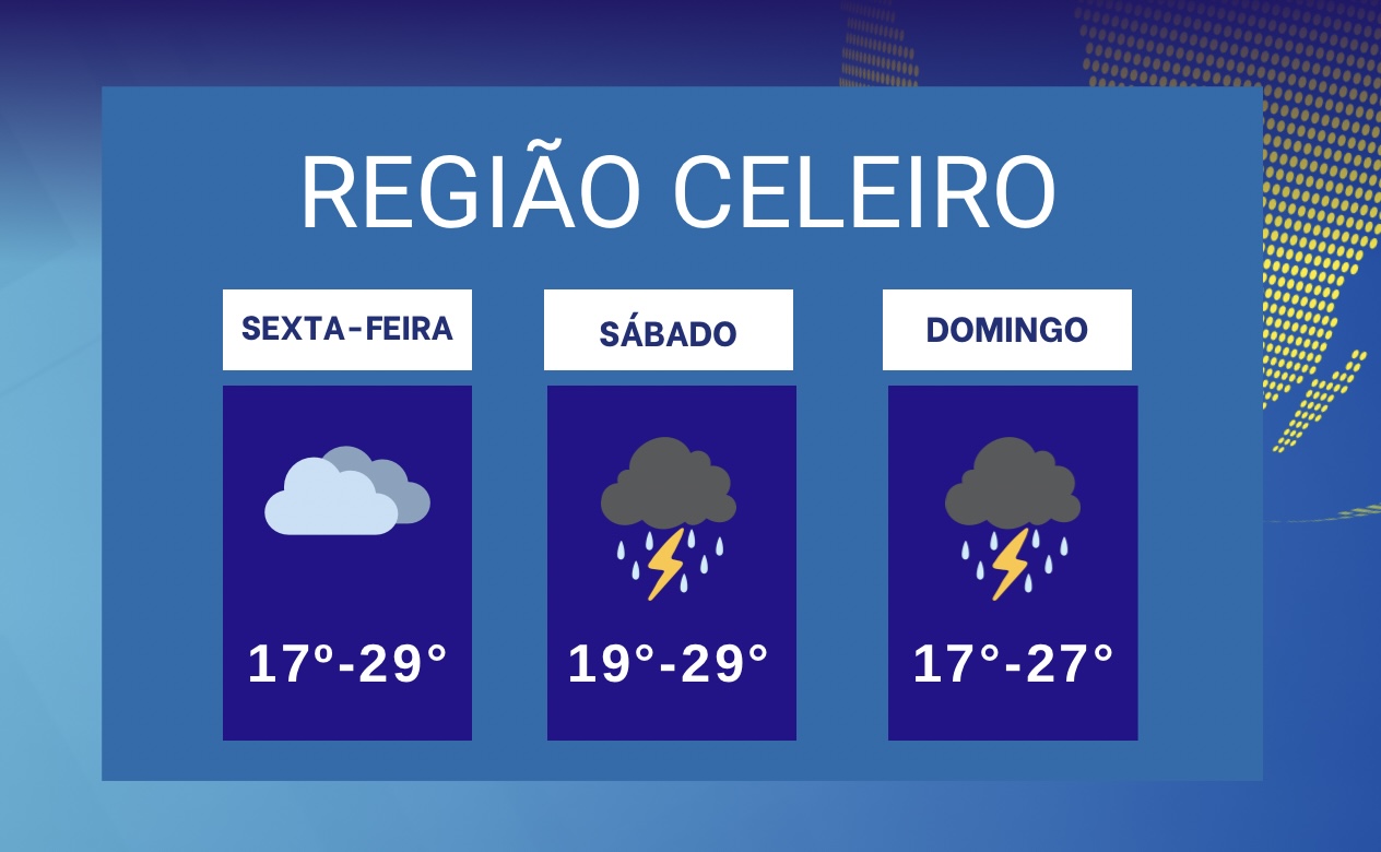 Para o sábado, a previsão aponta probabilidade de pancadas de chuva, com temperaturas variando entre 19 e 29 graus. No domingo, a instabilidade aumenta e a chuva deve ser mais intensa. As temperaturas ficam entre 17 e 27 graus.