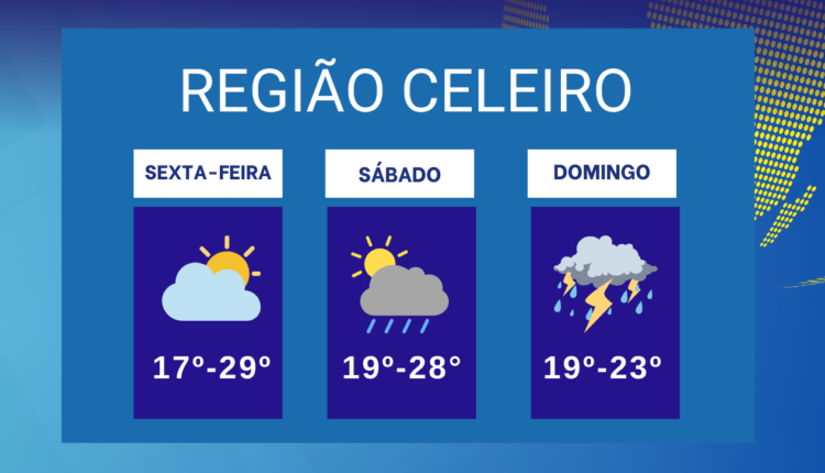 A Região Celeiro deve enfrentar mudanças nas condições climáticas ao longo do fim de semana. Nesta sexta-feira (19), o céu permanece parcialmente nublado, com pequena chance de chuva. As temperaturas variam entre 17 °C e 29 °C.