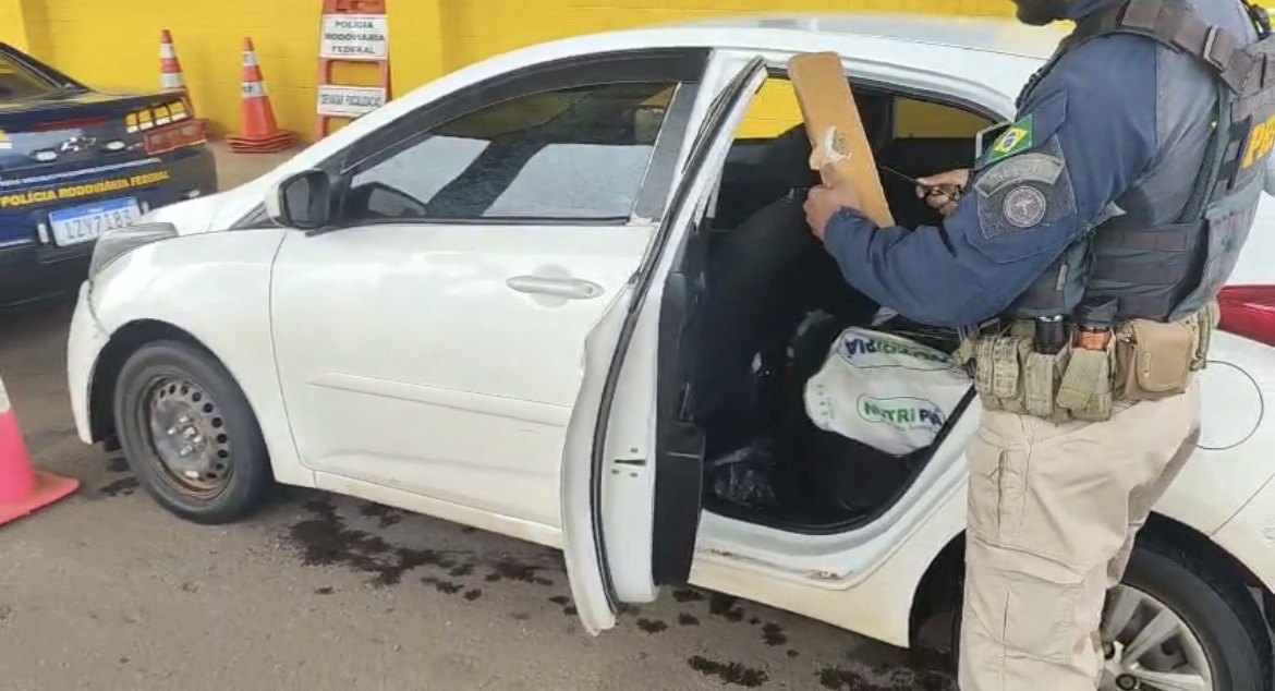 Durante uma ação de fiscalização voltada ao combate de crimes transfronteiriços, os policiais abordaram um HB20 com placas de Paulo Frontin (PR). Ao inspecionar o interior do automóvel, os agentes encontraram diversos tabletes de maconha escondidos em sacos de cereais sobre o banco traseiro. A pesagem totalizou 33,2 quilos da droga.