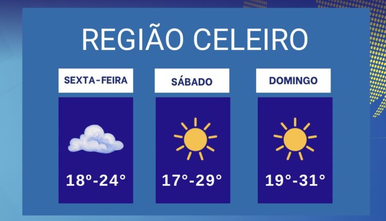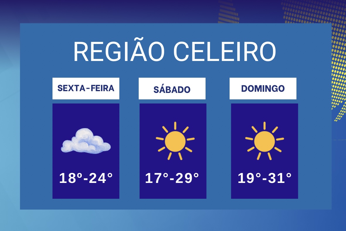 A Região Celeiro deve registrar chuva nesta sexta-feira, enquanto o sábado e o domingo terão predomínio de sol. As temperaturas variam de 18°C a 24°C na sexta, trazendo um dia mais úmido e de instabilidade.