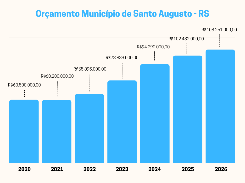 Tendo por objetivo manter o equilíbrio das contas públicas e garantir investimentos em setores estratégicos, Santo Augusto tem realizado diversas audiências públicas para publicizar o projeto da Lei Orçamentária Anual (LOA) 2026, que estima R$ 108,2 milhões para o próximo ano. O crescimento projetado é de cerca de 5% sobre o orçamento do ano anterior, mantendo Educação e Saúde como pilares centrais do planejamento financeiro municipal.