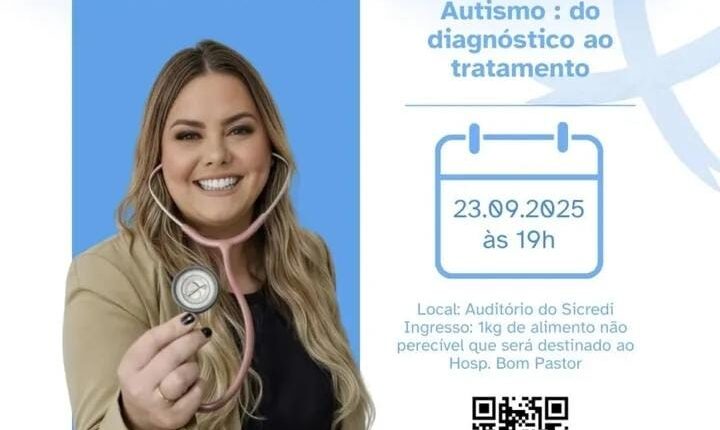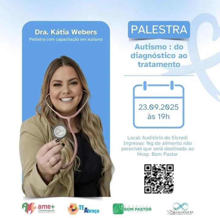 Nesta terça-feira terça-feira (23), Santo Augusto receberá uma palestra voltada ao tema “Autismo: do diagnóstico ao tratamento”, ministrada pela pediatra Dra. Kátia Webers, especialista com capacitação em autismo. O evento ocorrerá às 19h, no auditório do Sicredi.