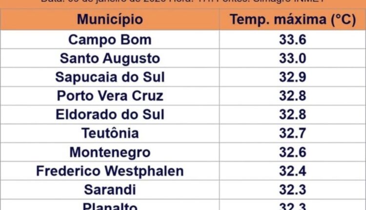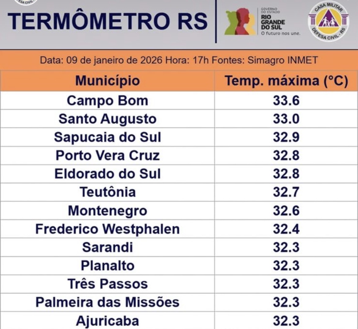 O levantamento, realizado às 17h, aponta que apenas Campo Bom, na Região Metropolitana, superou Santo Augusto, com máxima de 33,6°C. Na sequência do ranking aparecem Sapucaia do Sul (32,9°C), Porto Vera Cruz e Eldorado do Sul (32,8°C), além de diversos municípios das regiões Noroeste, Missões e Alto Jacuí, que também enfrentaram calor intenso.