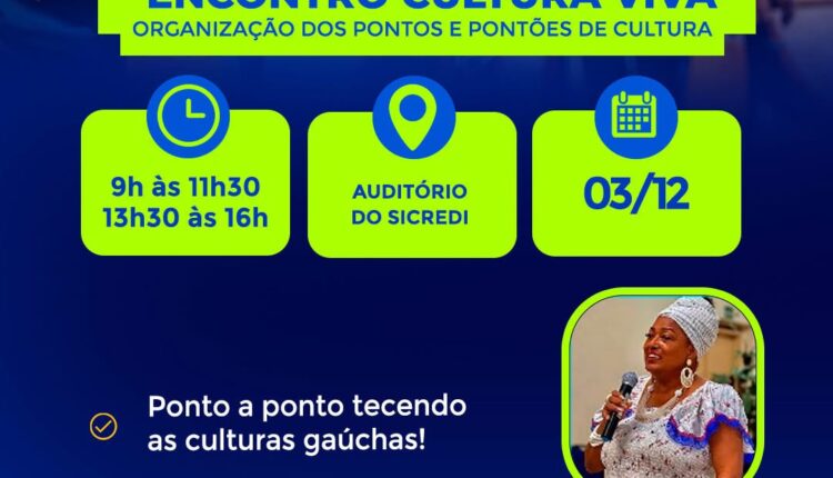 A Secretaria Municipal de Cultura, Turismo e Esporte de Santo Augusto realizará, no próximo dia 3 de dezembro de 2025, o Evento Cultura Viva, que acontece a partir das 9h, no Auditório da Sicredi, localizado na Rua Rio Branco, nº 1094. A atividade integra a agenda regional de fortalecimento das políticas culturais e será conduzida pela Mãe Carmem, reconhecida liderança cultural no Estado.