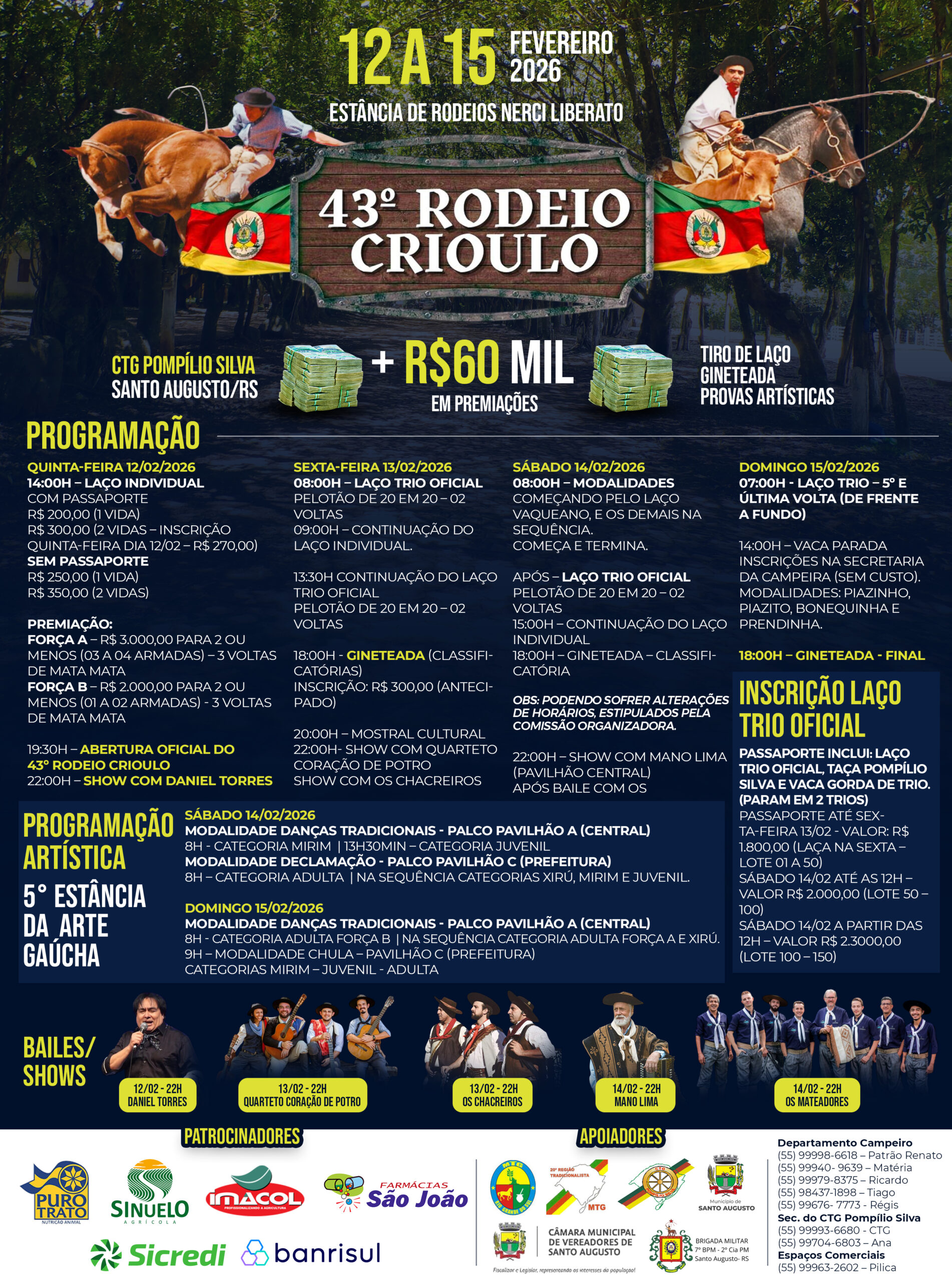 O tradicionalismo volta a pulsar com força em Santo Augusto na próxima semana, quando o município recebe o 43º Rodeio Crioulo do CTG Pompílio Silva, um dos eventos mais aguardados do calendário cultural regional. A programação inicia na quinta-feira, 12 de fevereiro, e segue até o domingo, 15, na Estância de Rodeios Nerci Liberato, reunindo provas campeiras, gineteadas, atrações artísticas, shows e milhares de visitantes de diferentes quadrantes do país e outros.