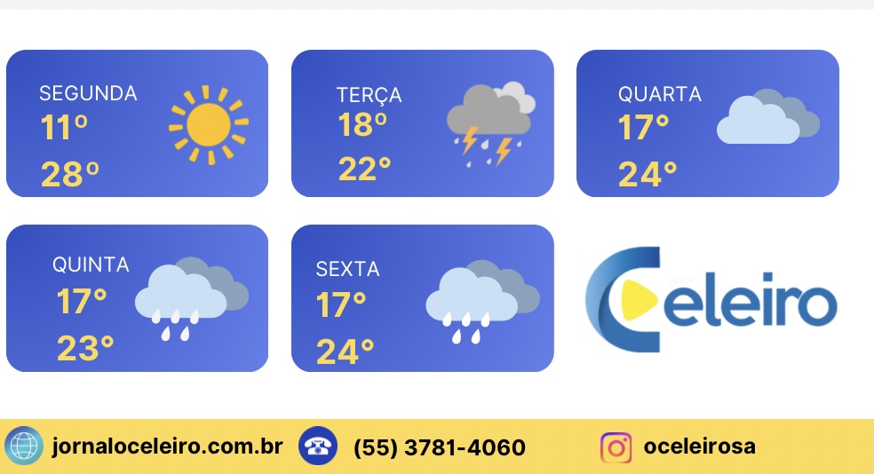 A semana inicia com tempo firme e temperaturas elevadas em Santo Augusto e região. Nesta segunda-feira (data), os termômetros marcam mínima de 11 °C e máxima de 28 °C, proporcionando um dia ensolarado.