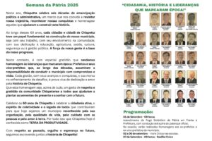 Com o tema “Cidadania, História e Lideranças que Marcaram Época”, as comemorações destacam a contribuição de cada cidadão para o crescimento do município e reforçam Chiapetta como Terra da Produtividade, reconhecida pela organização, qualidade de vida e cuidado com as pessoas.